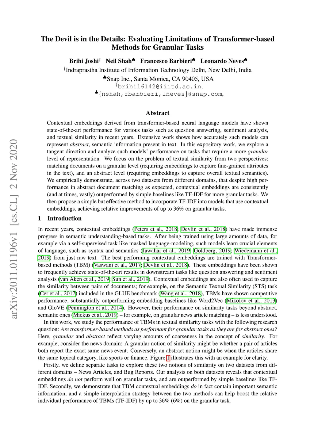 Contextual embeddings derived from transformer-based neural language models have shown state-of-the-art performance for various tasks such as question answering, sentiment analysis, and textual similarity in recent years. Extensive work shows how accurately such models can represent abstract, semantic information present in text. In this expository work, we explore a tangent direction and analyze such models' performance on tasks that require a more granular level of representation. We focus on the problem of textual similarity from two perspectives: matching documents on a granular level (requiring embeddings to capture fine-grained attributes in the text), and an abstract level (requiring embeddings to capture overall textual semantics). We empirically demonstrate, across two datasets from different domains, that despite high performance in abstract document matching as expected, contextual embeddings are consistently (and at times, vastly) outperformed by simple baselines like TF-IDF for more granular tasks. We then propose a simple but effective method to incorporate TF-IDF into models that use contextual embeddings, achieving relative improvements of up to 36% on granular tasks.