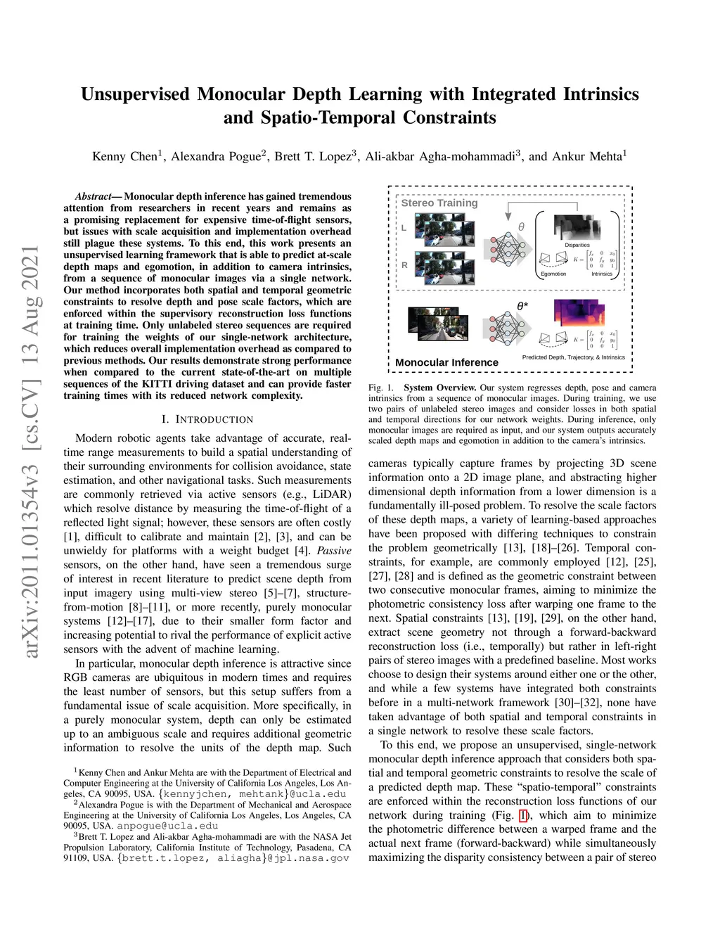 Monocular depth inference has gained tremendous attention from researchers in recent years and remains as a promising replacement for expensive time-of-flight sensors, but issues with scale acquisition and implementation overhead still plague these systems. To this end, this work presents an unsupervised learning framework that is able to predict at-scale depth maps and egomotion, in addition to camera intrinsics, from a sequence of monocular images via a single network. Our method incorporates both spatial and temporal geometric constraints to resolve depth and pose scale factors, which are enforced within the supervisory reconstruction loss functions at training time. Only unlabeled stereo sequences are required for training the weights of our single-network architecture, which reduces overall implementation overhead as compared to previous methods. Our results demonstrate strong performance when compared to the current state-of-the-art on multiple sequences of the KITTI driving dataset and can provide faster training times with its reduced network complexity.