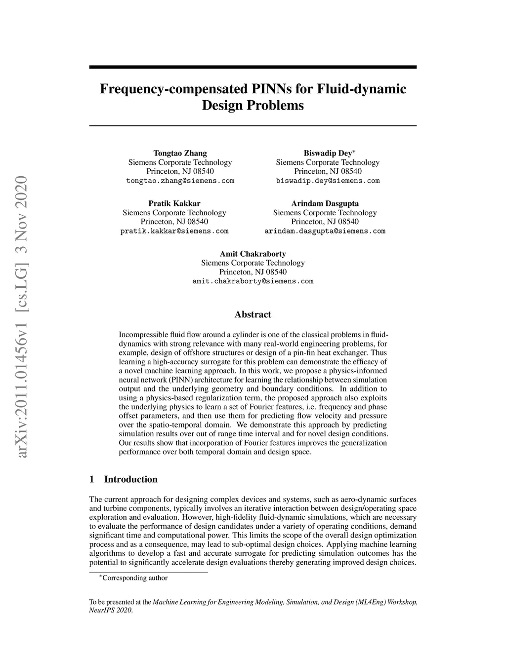 Incompressible fluid flow around a cylinder is one of the classical problems in fluid-dynamics with strong relevance with many real-world engineering problems, for example, design of offshore structures or design of a pin-fin heat exchanger. Thus learning a high-accuracy surrogate for this problem can demonstrate the efficacy of a novel machine learning approach. In this work, we propose a physics-informed neural network (PINN) architecture for learning the relationship between simulation output and the underlying geometry and boundary conditions. In addition to using a physics-based regularization term, the proposed approach also exploits the underlying physics to learn a set of Fourier features, i.e. frequency and phase offset parameters, and then use them for predicting flow velocity and pressure over the spatio-temporal domain. We demonstrate this approach by predicting simulation results over out of range time interval and for novel design conditions. Our results show that incorporation of Fourier features improves the generalization performance over both temporal domain and design space.