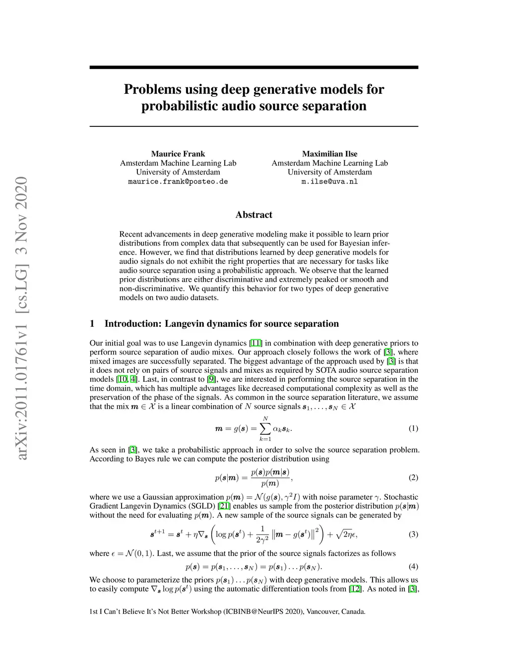 Recent advancements in deep generative modeling make it possible to learn prior distributions from complex data that subsequently can be used for Bayesian inference. However, we find that distributions learned by deep generative models for audio signals do not exhibit the right properties that are necessary for tasks like audio source separation using a probabilistic approach. We observe that the learned prior distributions are either discriminative and extremely peaked or smooth and non-discriminative. We quantify this behavior for two types of deep generative models on two audio datasets.