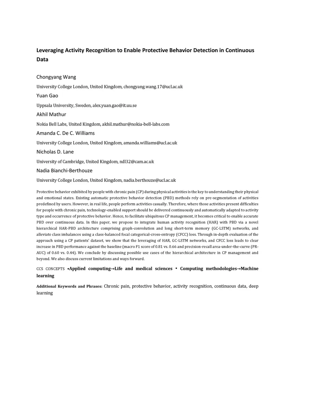 Protective behavior exhibited by people with chronic pain (CP) during physical activities is the key to understanding their physical and emotional states. Existing automatic protective behavior detection (PBD) methods rely on pre-segmentation of activities predefined by users. However, in real life, people perform activities casually. Therefore, where those activities present difficulties for people with chronic pain, technology-enabled support should be delivered continuously and automatically adapted to activity type and occurrence of protective behavior. Hence, to facilitate ubiquitous CP management, it becomes critical to enable accurate PBD over continuous data. In this paper, we propose to integrate human activity recognition (HAR) with PBD via a novel hierarchical HAR-PBD architecture comprising graph-convolution and long short-term memory (GC-LSTM) networks, and alleviate class imbalances using a class-balanced focal categorical-cross-entropy (CFCC) loss. Through in-depth evaluation of the approach using a CP patients' dataset, we show that the leveraging of HAR, GC-LSTM networks, and CFCC loss leads to clear increase in PBD performance against the baseline (macro F1 score of 0.81 vs. 0.66 and precision-recall area-under-the-curve (PR-AUC) of 0.60 vs. 0.44). We conclude by discussing possible use cases of the hierarchical architecture in CP management and beyond. We also discuss current limitations and ways forward.