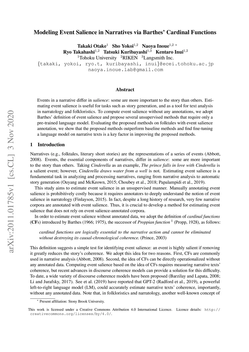 Modeling Event Salience in Narratives via Barthes' Cardinal Functions