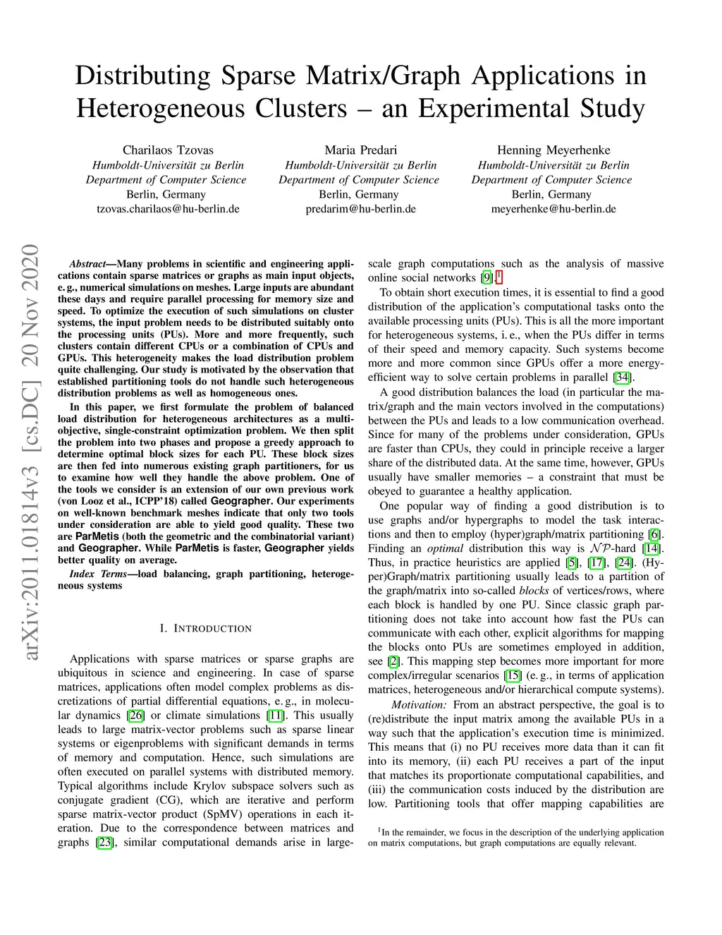 Many problems in scientific and engineering applications contain sparse matrices or graphs as main input objects, e.g. numerical simulations on meshes. Large inputs are abundant these days and require parallel processing for memory size and speed. To optimize the execution of such simulations on cluster systems, the input problem needs to be distributed suitably onto the processing units (PUs). More and more frequently, such clusters contain different CPUs or a combination of CPUs and GPUs. This heterogeneity makes the load distribution problem quite challenging. Our study is motivated by the observation that established partitioning tools do not handle such heterogeneous distribution problems as well as homogeneous ones. In this paper, we first formulate the problem of balanced load distribution for heterogeneous architectures as a multi-objective, single-constraint optimization problem. We then split the problem into two phases and propose a greedy approach to determine optimal block sizes for each PU. These block sizes are then fed into numerous existing graph partitioners, for us to examine how well they handle the above problem. One of the tools we consider is an extension of our own previous work (von Looz et al, ICPP'18) called Geographer. Our experiments on well-known benchmark meshes indicate that only two tools under consideration are able to yield good quality. These two are Parmetis (both the geometric and the combinatorial variant) and Geographer. While Parmetis is faster, Geographer yields better quality on average.