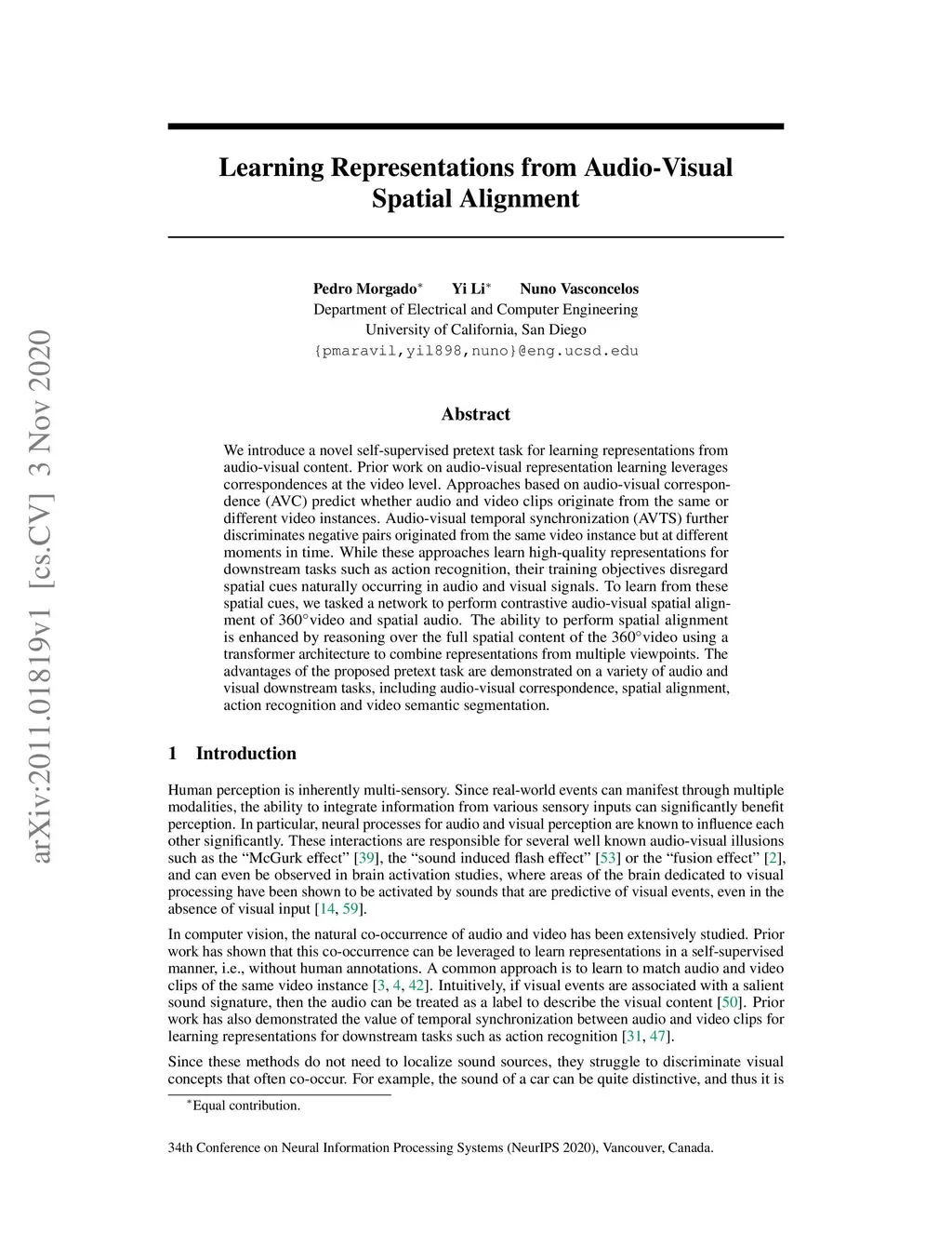 Learning Representations from Audio-Visual Spatial Alignment