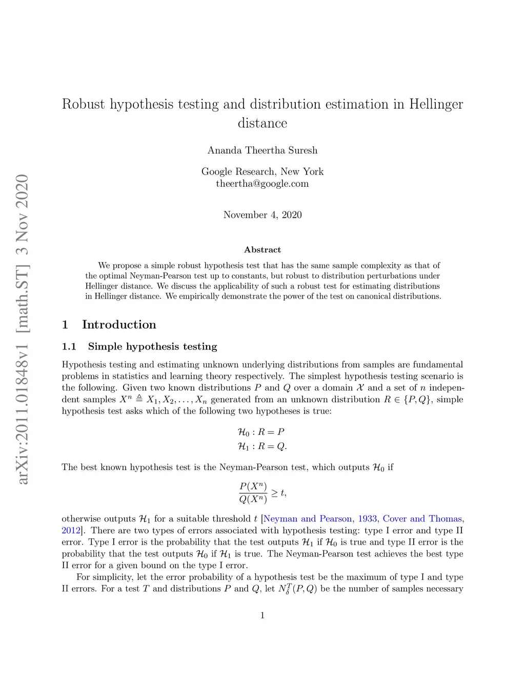 We propose a simple robust hypothesis test that has the same sample complexity as that of the optimal Neyman-Pearson test up to constants, but robust to distribution perturbations under Hellinger distance. We discuss the applicability of such a robust test for estimating distributions in Hellinger distance. We empirically demonstrate the power of the test on canonical distributions.