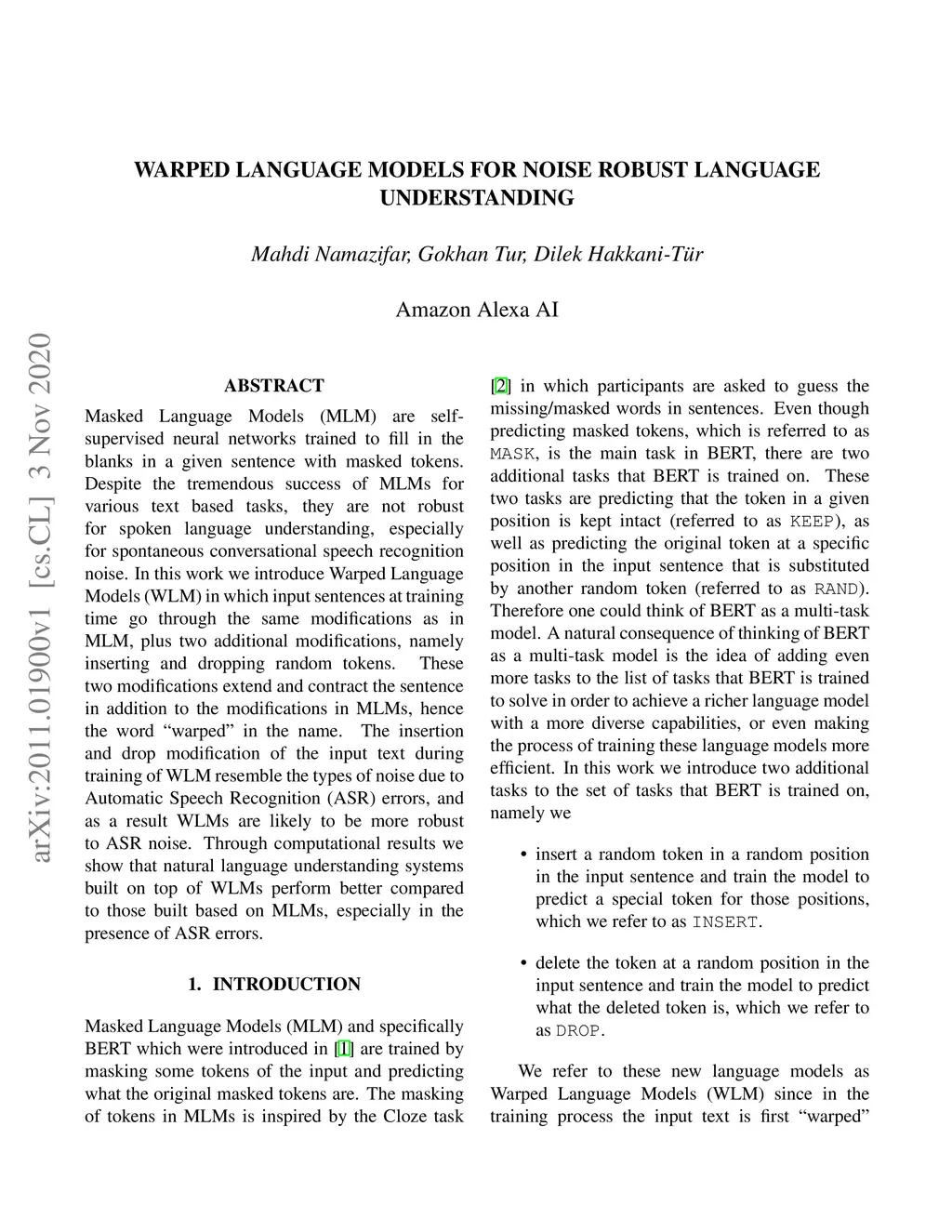 Masked Language Models (MLM) are self-supervised neural networks trained to fill in the blanks in a given sentence with masked tokens. Despite the tremendous success of MLMs for various text based tasks, they are not robust for spoken language understanding, especially for spontaneous conversational speech recognition noise. In this work we introduce Warped Language Models (WLM) in which input sentences at training time go through the same modifications as in MLM, plus two additional modifications, namely inserting and dropping random tokens. These two modifications extend and contract the sentence in addition to the modifications in MLMs, hence the word "warped" in the name. The insertion and drop modification of the input text during training of WLM resemble the types of noise due to Automatic Speech Recognition (ASR) errors, and as a result WLMs are likely to be more robust to ASR noise. Through computational results we show that natural language understanding systems built on top of WLMs perform better compared to those built based on MLMs, especially in the presence of ASR errors.