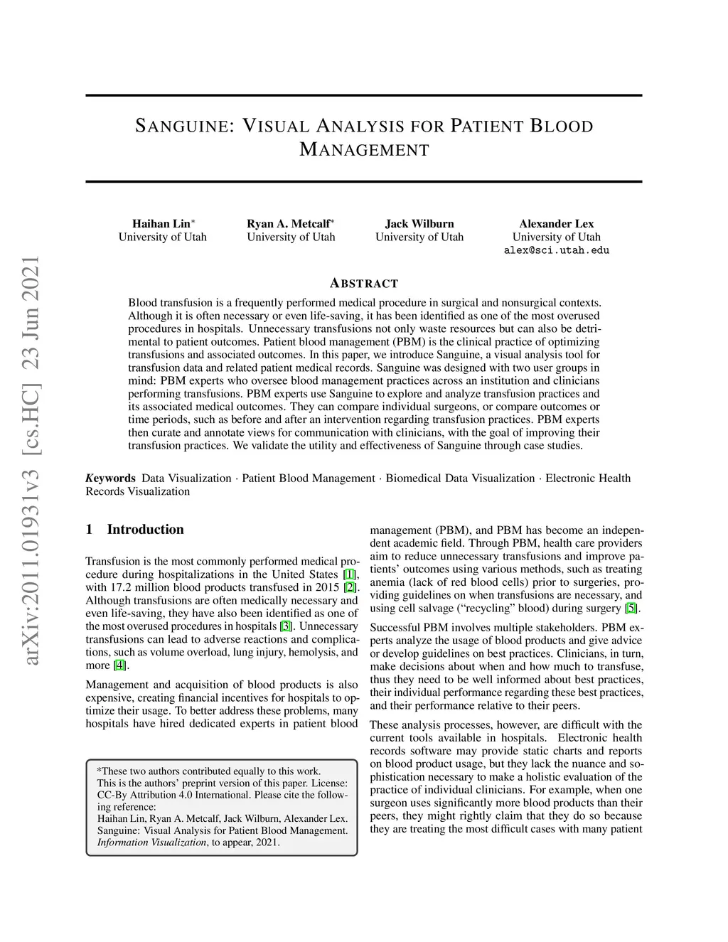 Blood transfusion is a frequently performed medical procedure in surgical and nonsurgical contexts. Although it is frequently necessary or even life-saving, it has been identified as one of the most overused procedures in hospitals. Unnecessary transfusions not only waste resources but can also be detrimental to patient outcomes. Patient blood management (PBM) is the clinical practice of optimizing transfusions and associated outcomes. In this paper, we introduce Sanguine, a visual analysis tool for transfusion data and related patient medical records. Sanguine was designed with two user groups in mind: PBM experts and clinicians who conduct transfusions. PBM experts use Sanguine to explore and analyze transfusion practices and its associated medical outcomes. They can compare individual surgeons, or compare outcomes or time periods, such as before and after an intervention regarding transfusion practices. PBM experts then curate and annotate views for communication with clinicians, with the goal of improving their transfusion practices. Such a review session could be in person or through a shared link. We validate the utility and effectiveness of Sanguine through case studies.