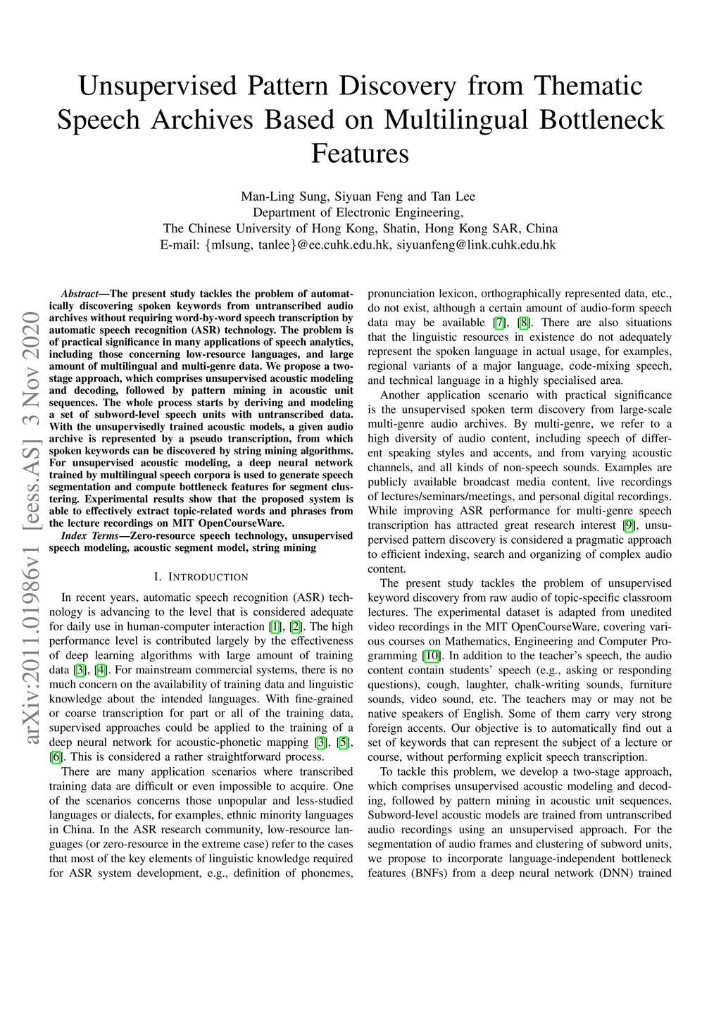 The present study tackles the problem of automatically discovering spoken keywords from untranscribed audio archives without requiring word-by-word speech transcription by automatic speech recognition (ASR) technology. The problem is of practical significance in many applications of speech analytics, including those concerning low-resource languages, and large amount of multilingual and multi-genre data. We propose a two-stage approach, which comprises unsupervised acoustic modeling and decoding, followed by pattern mining in acoustic unit sequences. The whole process starts by deriving and modeling a set of subword-level speech units with untranscribed data. With the unsupervisedly trained acoustic models, a given audio archive is represented by a pseudo transcription, from which spoken keywords can be discovered by string mining algorithms. For unsupervised acoustic modeling, a deep neural network trained by multilingual speech corpora is used to generate speech segmentation and compute bottleneck features for segment clustering. Experimental results show that the proposed system is able to effectively extract topic-related words and phrases from the lecture recordings on MIT OpenCourseWare.