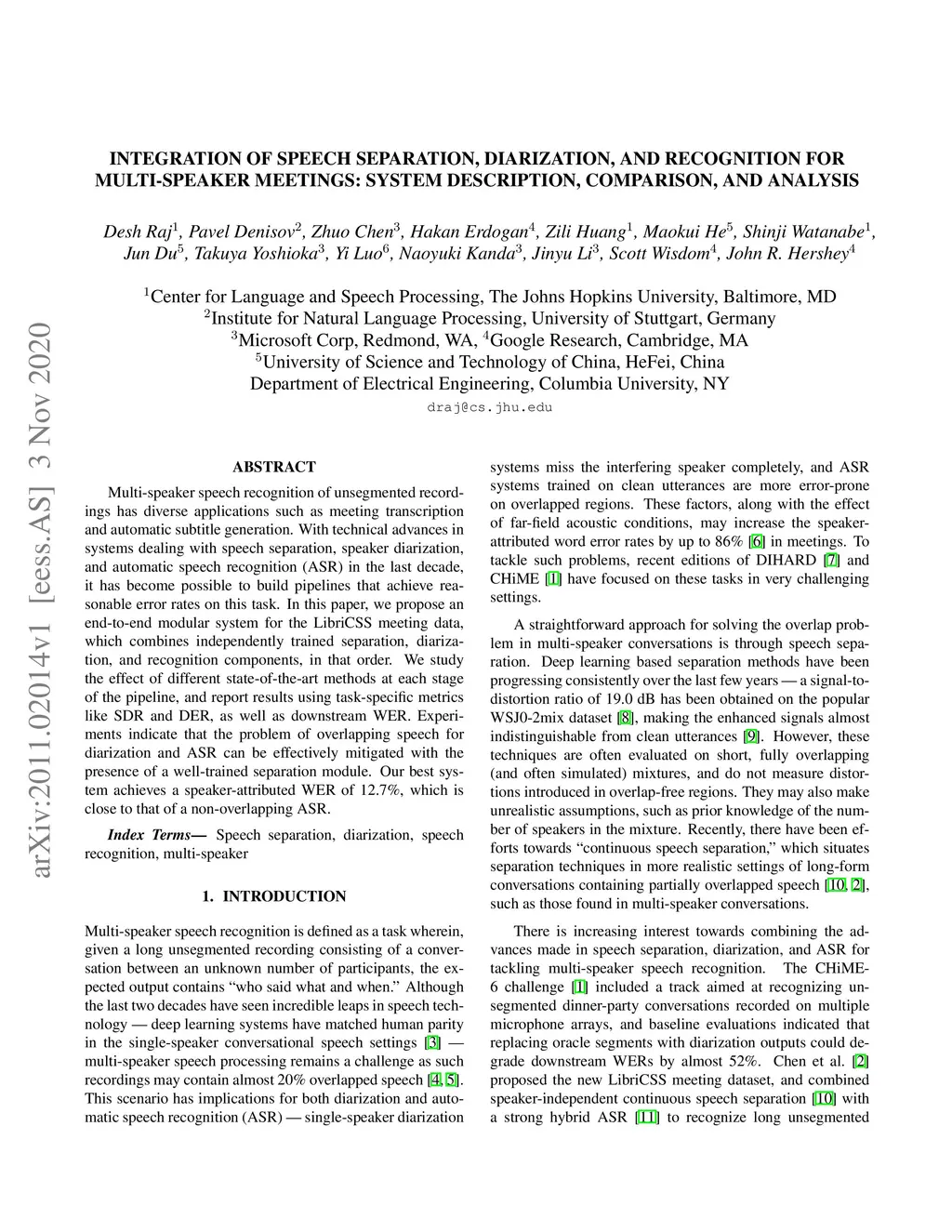 Multi-speaker speech recognition of unsegmented recordings has diverse applications such as meeting transcription and automatic subtitle generation. With technical advances in systems dealing with speech separation, speaker diarization, and automatic speech recognition (ASR) in the last decade, it has become possible to build pipelines that achieve reasonable error rates on this task. In this paper, we propose an end-to-end modular system for the LibriCSS meeting data, which combines independently trained separation, diarization, and recognition components, in that order. We study the effect of different state-of-the-art methods at each stage of the pipeline, and report results using task-specific metrics like SDR and DER, as well as downstream WER. Experiments indicate that the problem of overlapping speech for diarization and ASR can be effectively mitigated with the presence of a well-trained separation module. Our best system achieves a speaker-attributed WER of 12.7%, which is close to that of a non-overlapping ASR.