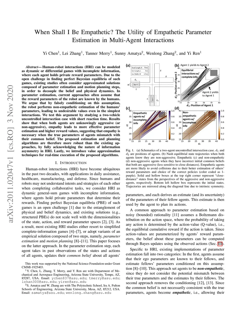 Human-robot interactions (HRI) can be modeled as dynamic or differential games with incomplete information, where each agent holds private reward parameters. Due to the open challenge in finding perfect Bayesian equilibria of such games, existing studies often consider approximated solutions composed of parameter estimation and motion planning steps, in order to decouple the belief and physical dynamics. In parameter estimation, current approaches often assume that the reward parameters of the robot are known by the humans. We argue that by falsely conditioning on this assumption, the robot performs non-empathetic estimation of the humans' parameters, leading to undesirable values even in the simplest interactions. We test this argument by studying a two-vehicle uncontrolled intersection case with short reaction time. Results show that when both agents are unknowingly aggressive (or non-aggressive), empathy leads to more effective parameter estimation and higher reward values, suggesting that empathy is necessary when the true parameters of agents mismatch with their common belief. The proposed estimation and planning algorithms are therefore more robust than the existing approaches, by fully acknowledging the nature of information asymmetry in HRI. Lastly, we introduce value approximation techniques for real-time execution of the proposed algorithms.