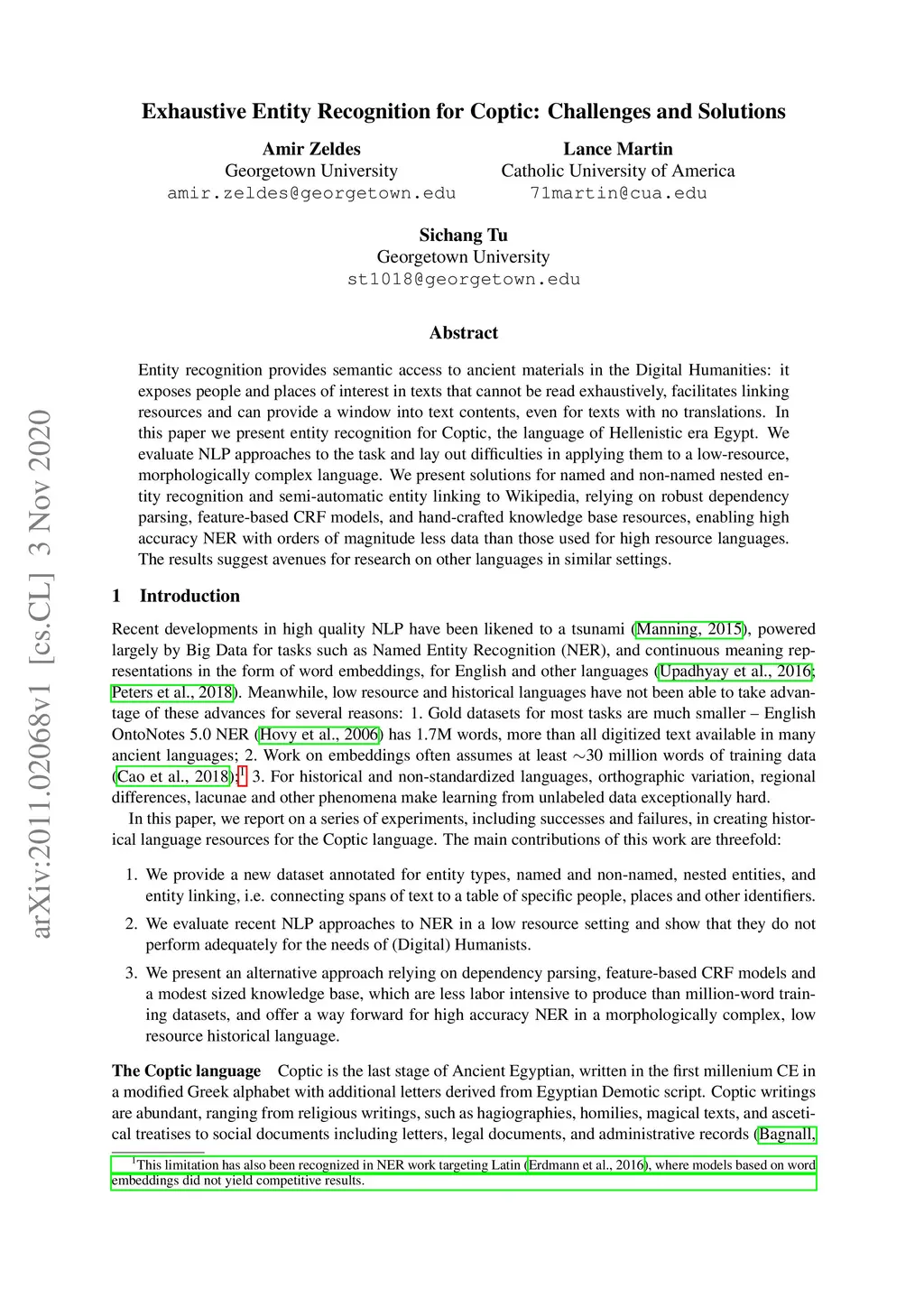 Exhaustive Entity Recognition for Coptic: Challenges and Solutions