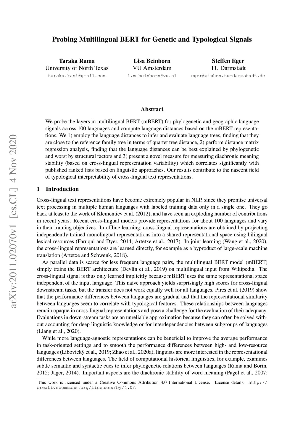 We probe the layers in multilingual BERT (mBERT) for phylogenetic and geographic language signals across 100 languages and compute language distances based on the mBERT representations. We 1) employ the language distances to infer and evaluate language trees, finding that they are close to the reference family tree in terms of quartet tree distance, 2) perform distance matrix regression analysis, finding that the language distances can be best explained by phylogenetic and worst by structural factors and 3) present a novel measure for measuring diachronic meaning stability (based on cross-lingual representation variability) which correlates significantly with published ranked lists based on linguistic approaches. Our results contribute to the nascent field of typological interpretability of cross-lingual text representations.
