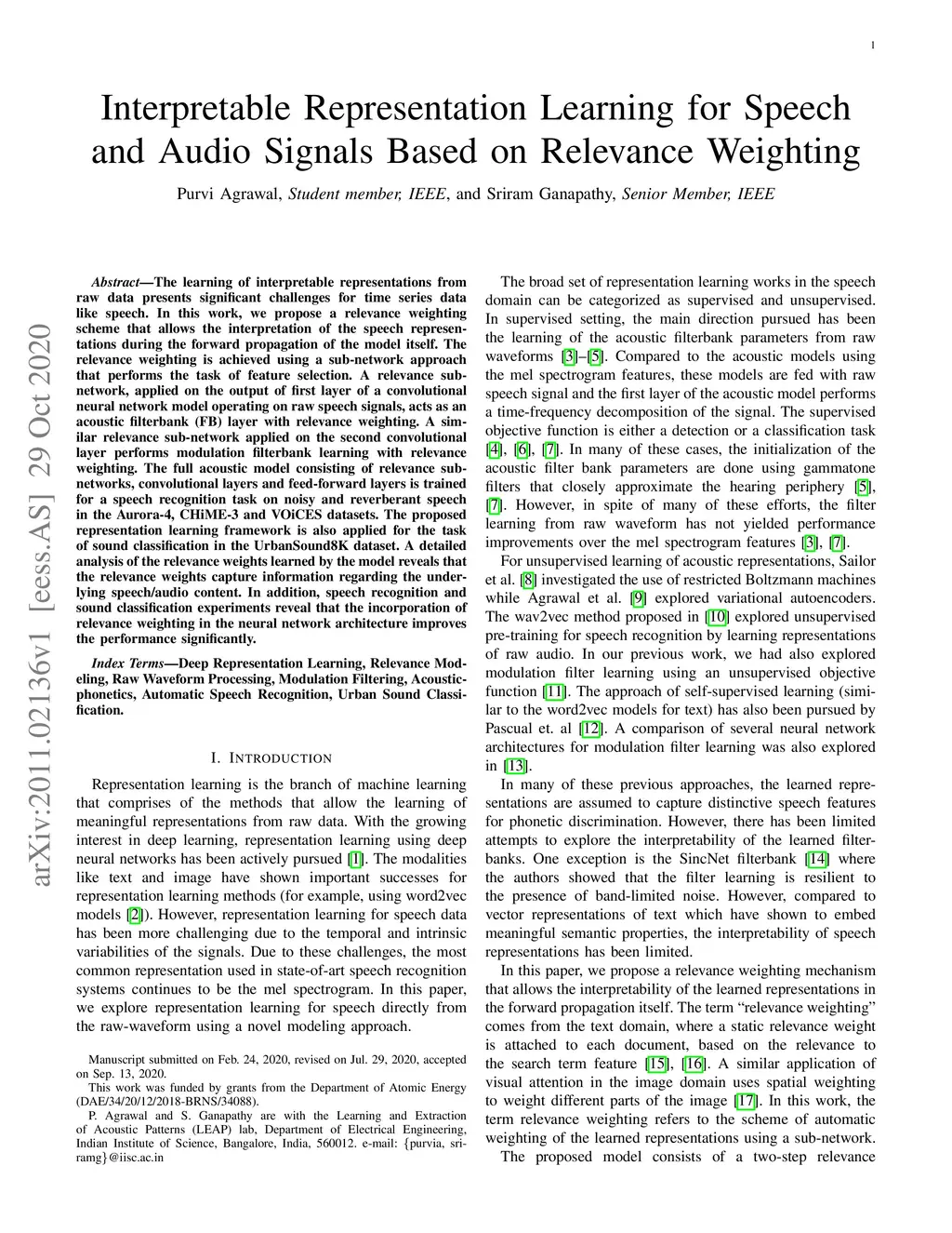 The learning of interpretable representations from raw data presents significant challenges for time series data like speech. In this work, we propose a relevance weighting scheme that allows the interpretation of the speech representations during the forward propagation of the model itself. The relevance weighting is achieved using a sub-network approach that performs the task of feature selection. A relevance sub-network, applied on the output of first layer of a convolutional neural network model operating on raw speech signals, acts as an acoustic filterbank (FB) layer with relevance weighting. A similar relevance sub-network applied on the second convolutional layer performs modulation filterbank learning with relevance weighting. The full acoustic model consisting of relevance sub-networks, convolutional layers and feed-forward layers is trained for a speech recognition task on noisy and reverberant speech in the Aurora-4, CHiME-3 and VOiCES datasets. The proposed representation learning framework is also applied for the task of sound classification in the UrbanSound8K dataset. A detailed analysis of the relevance weights learned by the model reveals that the relevance weights capture information regarding the underlying speech/audio content. In addition, speech recognition and sound classification experiments reveal that the incorporation of relevance weighting in the neural network architecture improves the performance significantly.