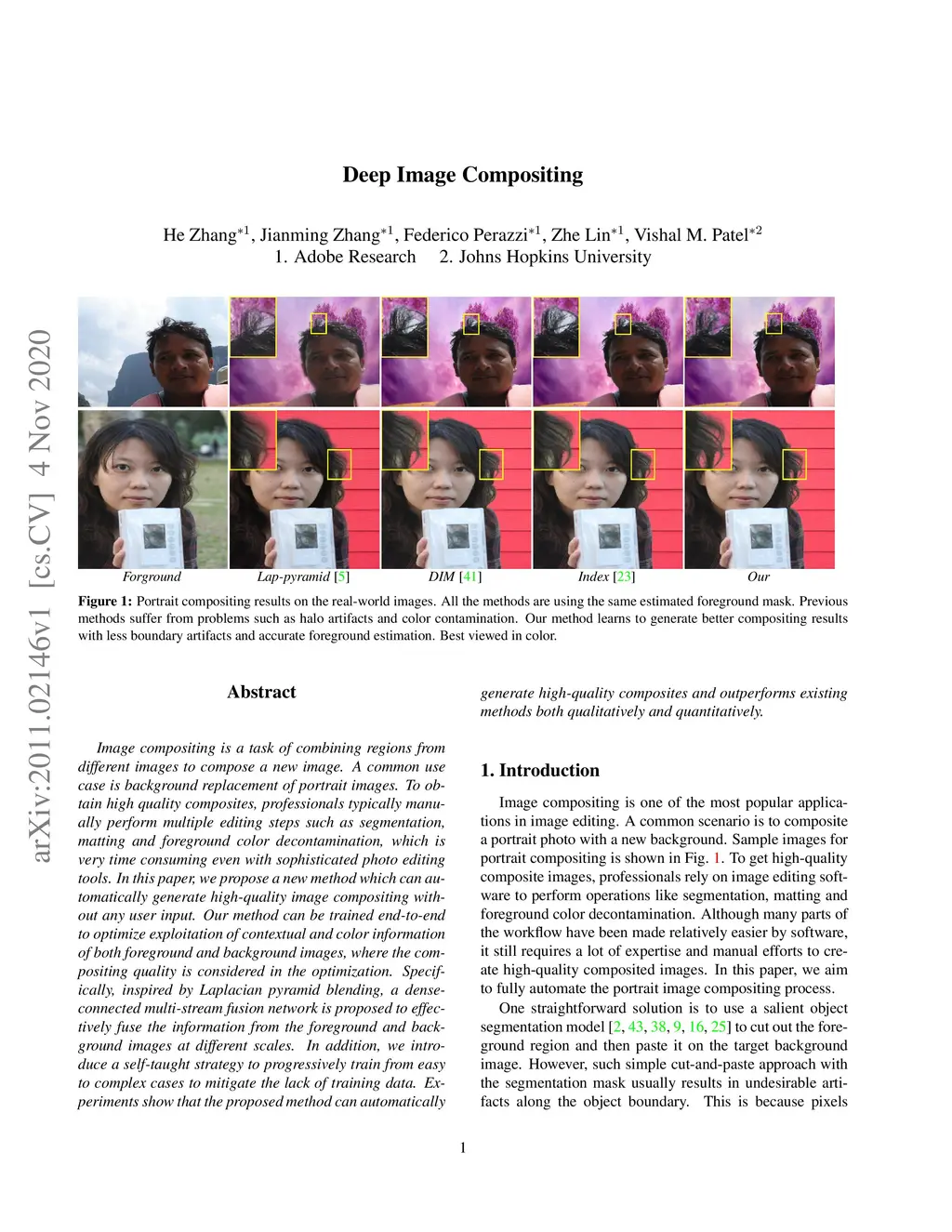 Image compositing is a task of combining regions from different images to compose a new image. A common use case is background replacement of portrait images. To obtain high quality composites, professionals typically manually perform multiple editing steps such as segmentation, matting and foreground color decontamination, which is very time consuming even with sophisticated photo editing tools. In this paper, we propose a new method which can automatically generate high-quality image compositing without any user input. Our method can be trained end-to-end to optimize exploitation of contextual and color information of both foreground and background images, where the compositing quality is considered in the optimization. Specifically, inspired by Laplacian pyramid blending, a dense-connected multi-stream fusion network is proposed to effectively fuse the information from the foreground and background images at different scales. In addition, we introduce a self-taught strategy to progressively train from easy to complex cases to mitigate the lack of training data. Experiments show that the proposed method can automatically generate high-quality composites and outperforms existing methods both qualitatively and quantitatively.