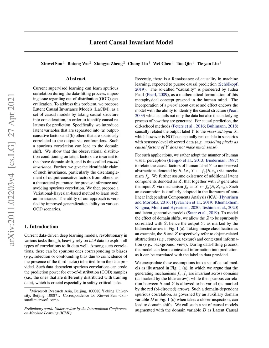Current supervised learning can learn spurious correlation during the data-fitting process, imposing issues regarding interpretability, out-of-distribution (OOD) generalization, and robustness. To avoid spurious correlation, we propose a Latent Causal Invariance Model (LaCIM) which pursues causal prediction. Specifically, we introduce latent variables that are separated into (a) output-causative factors and (b) others that are spuriously correlated to the output via confounders, to model the underlying causal factors. We further assume the generating mechanisms from latent space to observed data to be causally invariant. We give the identifiable claim of such invariance, particularly the disentanglement of output-causative factors from others, as a theoretical guarantee for precise inference and avoiding spurious correlation. We propose a Variational-Bayesian-based method for estimation and to optimize over the latent space for prediction. The utility of our approach is verified by improved interpretability, prediction power on various OOD scenarios (including healthcare) and robustness on security.