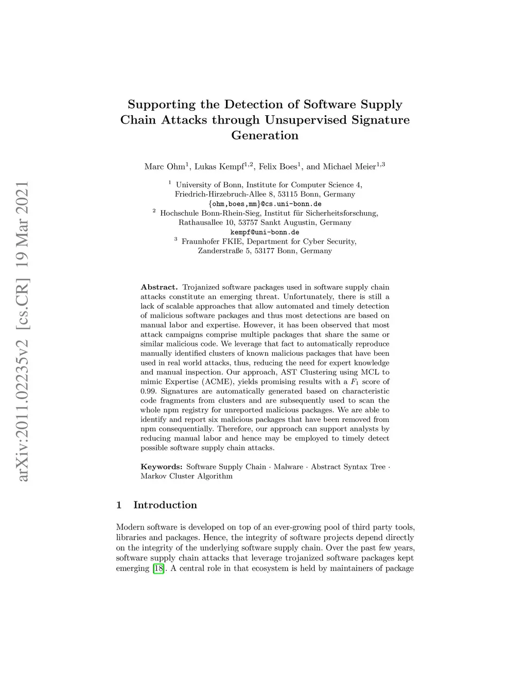 Trojanized software packages used in software supply chain attacks constitute an merging threat. Unfortunately, there is still a lack of scalable approaches that allow automated and timely detection of malicious software packages. However, it has been observed that most attack campaigns comprise multiple packages that share the same or similar malicious code. We leverage that fact to automatically reproduce manually identified clusters of known malicious packages that have been used in real world attacks, thus, reducing the need for expert knowledge and manual inspection. Our approach, AST Clustering using MCL to mimic Expertise (ACME), yields promising results with a score of 0.99. Signatures are automatically generated based on representative code fragments from clusters and are subsequently used to scan the whole npm registry for unreported malicious packages. We are able to identify and report six malicious packages that have been removed from npm consequentially. Therefore, our approach is able to reproduce clustering based on expert knowledge and hence may be employed by maintainers of package repositories like npm to timely detect possible maliciousness of newly uploaded or updated packages.