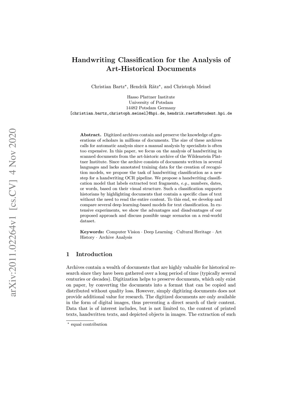 Handwriting Classification for the Analysis of Art-Historical Documents