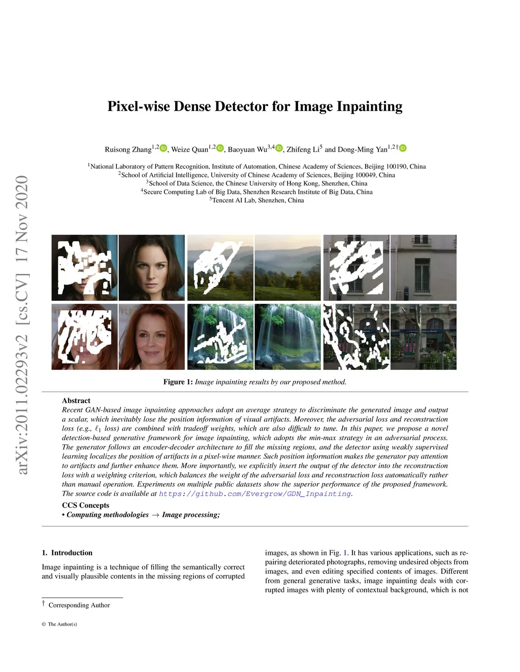Recent GAN-based image inpainting approaches adopt an average strategy to discriminate the generated image and output a scalar, which inevitably lose the position information of visual artifacts. Moreover, the adversarial loss and reconstruction loss (e.g., l1 loss) are combined with tradeoff weights, which are also difficult to tune. In this paper, we propose a novel detection-based generative framework for image inpainting, which adopts the min-max strategy in an adversarial process. The generator follows an encoder-decoder architecture to fill the missing regions, and the detector using weakly supervised learning localizes the position of artifacts in a pixel-wise manner. Such position information makes the generator pay attention to artifacts and further enhance them. More importantly, we explicitly insert the output of the detector into the reconstruction loss with a weighting criterion, which balances the weight of the adversarial loss and reconstruction loss automatically rather than manual operation. Experiments on multiple public datasets show the superior performance of the proposed framework. The source code is available at https://github.com/Evergrow/GDN_Inpainting.