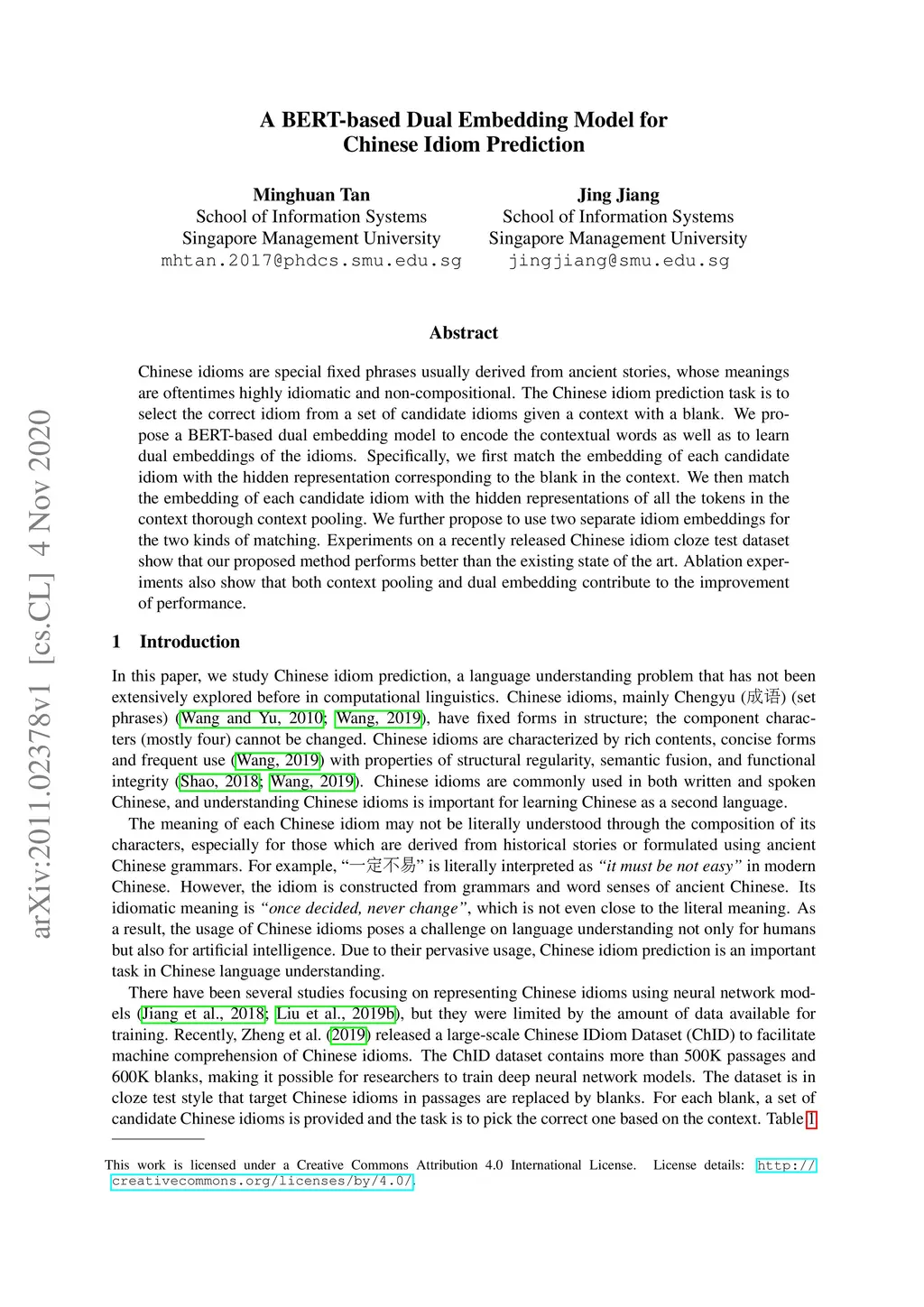 A BERT-based Dual Embedding Model for Chinese Idiom Prediction