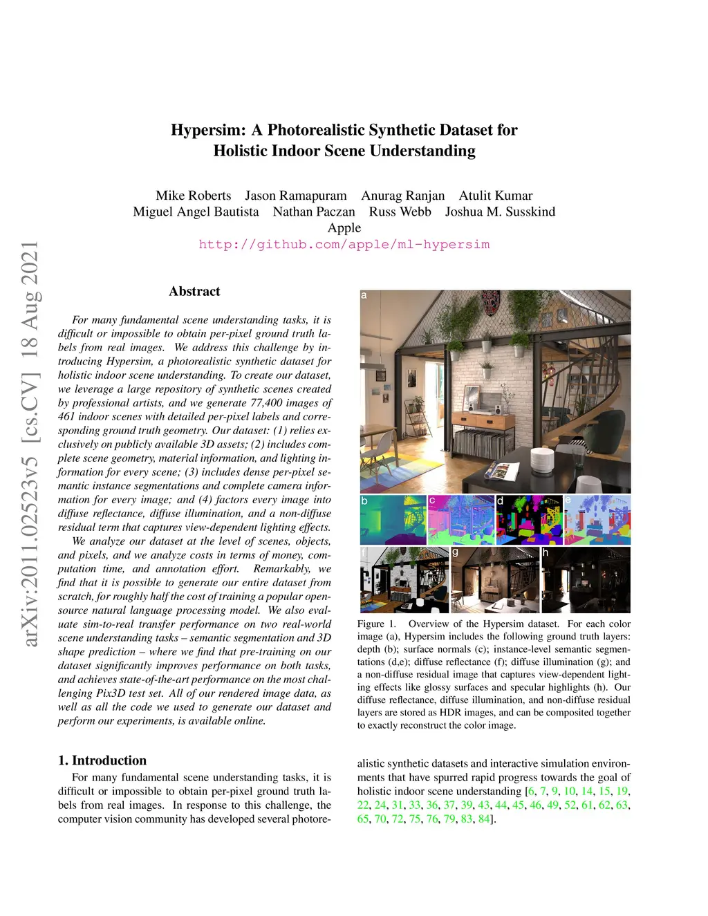 Hypersim: A Photorealistic Synthetic Dataset for Holistic Indoor Scene