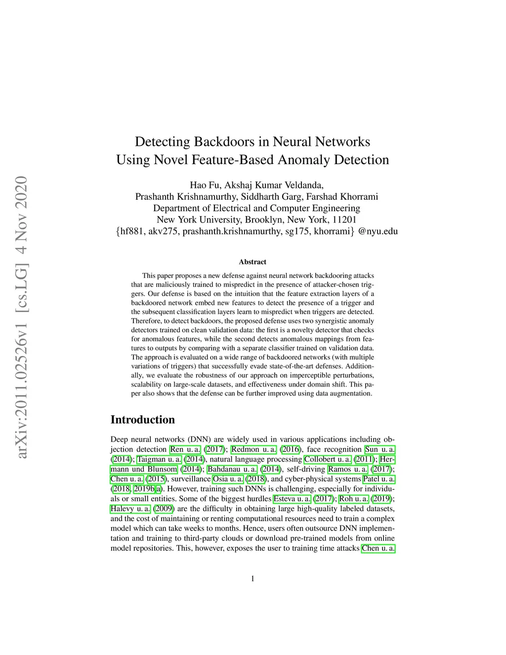 Detecting Backdoors in Neural Networks Using Novel Feature-Based Anomaly