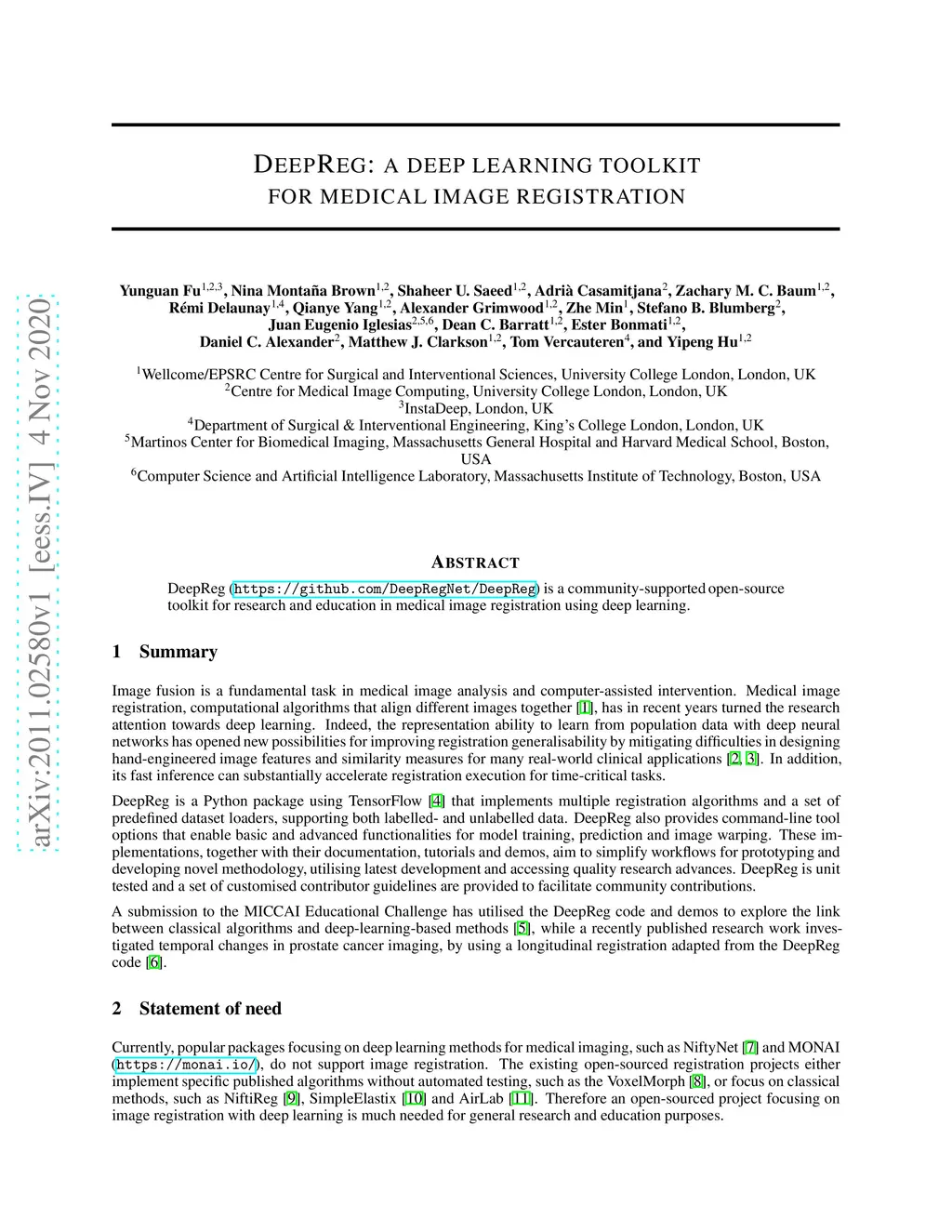 DeepReg (https://github.com/DeepRegNet/DeepReg) is a community-supported open-source toolkit for research and education in medical image registration using deep learning.