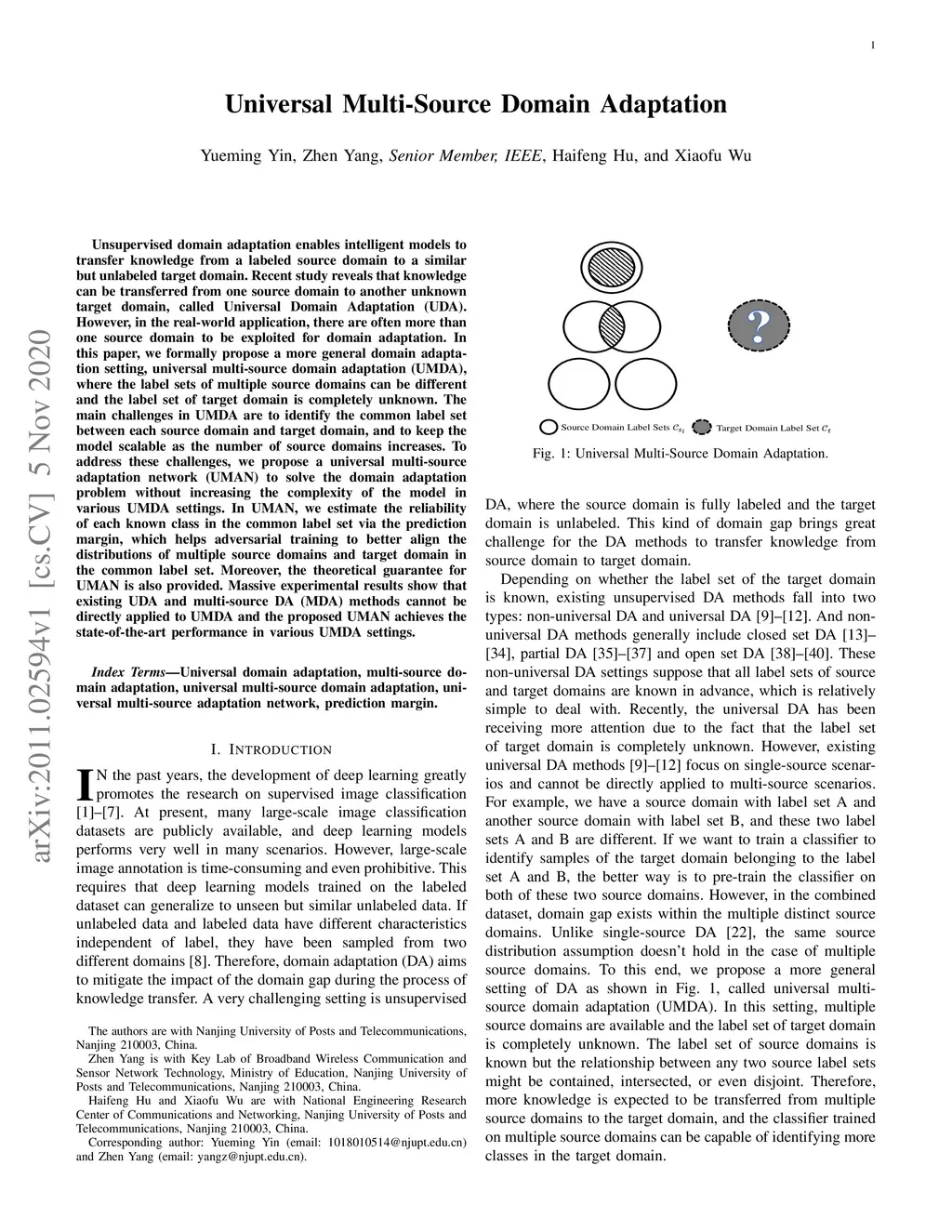 Unsupervised domain adaptation enables intelligent models to transfer knowledge from a labeled source domain to a similar but unlabeled target domain. Recent study reveals that knowledge can be transferred from one source domain to another unknown target domain, called Universal Domain Adaptation (UDA). However, in the real-world application, there are often more than one source domain to be exploited for domain adaptation. In this paper, we formally propose a more general domain adaptation setting, universal multi-source domain adaptation (UMDA), where the label sets of multiple source domains can be different and the label set of target domain is completely unknown. The main challenges in UMDA are to identify the common label set between each source domain and target domain, and to keep the model scalable as the number of source domains increases. To address these challenges, we propose a universal multi-source adaptation network (UMAN) to solve the domain adaptation problem without increasing the complexity of the model in various UMDA settings. In UMAN, we estimate the reliability of each known class in the common label set via the prediction margin, which helps adversarial training to better align the distributions of multiple source domains and target domain in the common label set. Moreover, the theoretical guarantee for UMAN is also provided. Massive experimental results show that existing UDA and multi-source DA (MDA) methods cannot be directly applied to UMDA and the proposed UMAN achieves the state-of-the-art performance in various UMDA settings.
