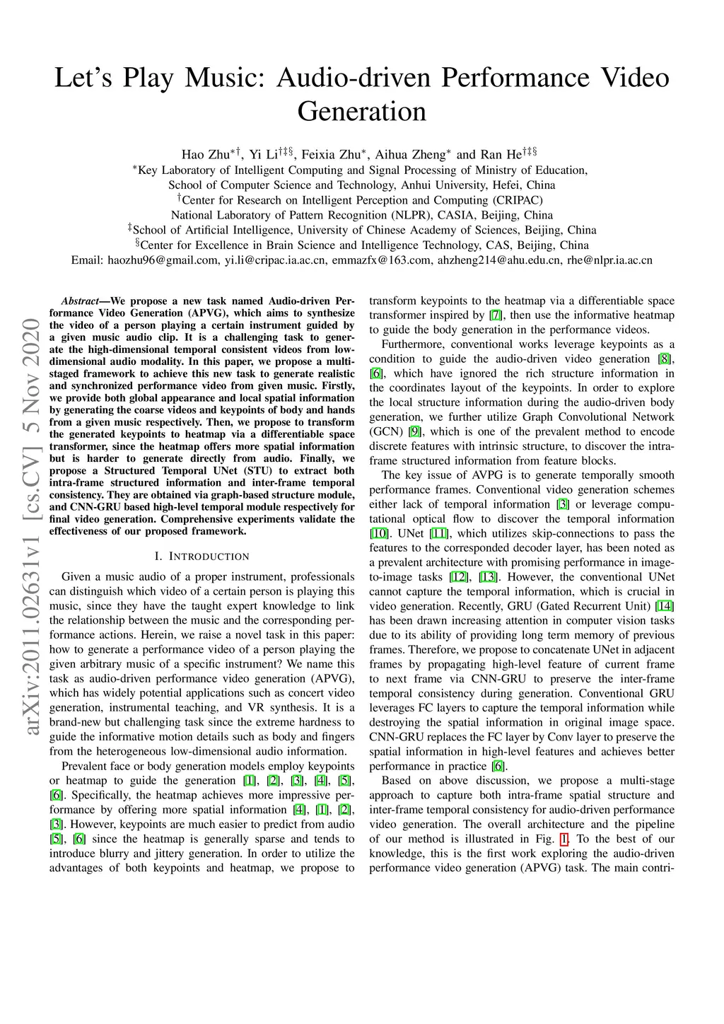 We propose a new task named Audio-driven Per-formance Video Generation (APVG), which aims to synthesizethe video of a person playing a certain instrument guided bya given music audio clip. It is a challenging task to gener-ate the high-dimensional temporal consistent videos from low-dimensional audio modality. In this paper, we propose a multi-staged framework to achieve this new task to generate realisticand synchronized performance video from given music. Firstly,we provide both global appearance and local spatial informationby generating the coarse videos and keypoints of body and handsfrom a given music respectively. Then, we propose to transformthe generated keypoints to heatmap via a differentiable spacetransformer, since the heatmap offers more spatial informationbut is harder to generate directly from audio. Finally, wepropose a Structured Temporal UNet (STU) to extract bothintra-frame structured information and inter-frame temporalconsistency. They are obtained via graph-based structure module,and CNN-GRU based high-level temporal module respectively forfinal video generation. Comprehensive experiments validate theeffectiveness of our proposed framework.