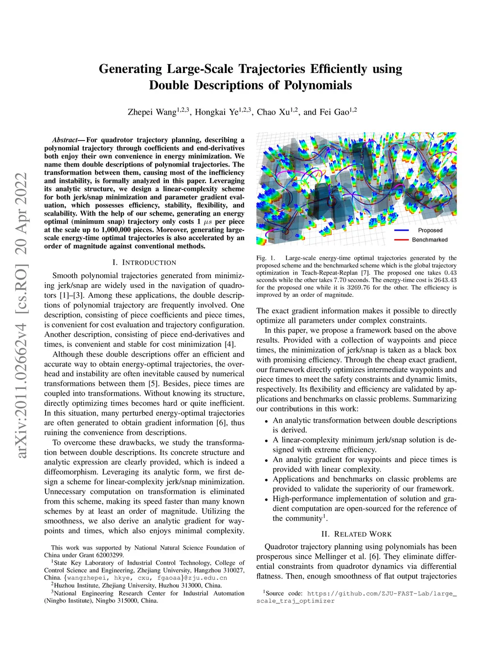 For quadrotor trajectory planning, describing a polynomial trajectory through coefficients and end-derivatives both enjoy their own convenience in energy minimization. We name them double descriptions of polynomial trajectories. The transformation between them, causing most of the inefficiency and instability, is formally analyzed in this paper. Leveraging its analytic structure, we design a linear-complexity scheme for both jerk/snap minimization and parameter gradient evaluation, which possesses efficiency, stability, flexibility, and scalability. With the help of our scheme, generating an energy optimal (minimum snap) trajectory only costs 1 per piece at the scale up to 1,000,000 pieces. Moreover, generating large-scale energy-time optimal trajectories is also accelerated by an order of magnitude against conventional methods.