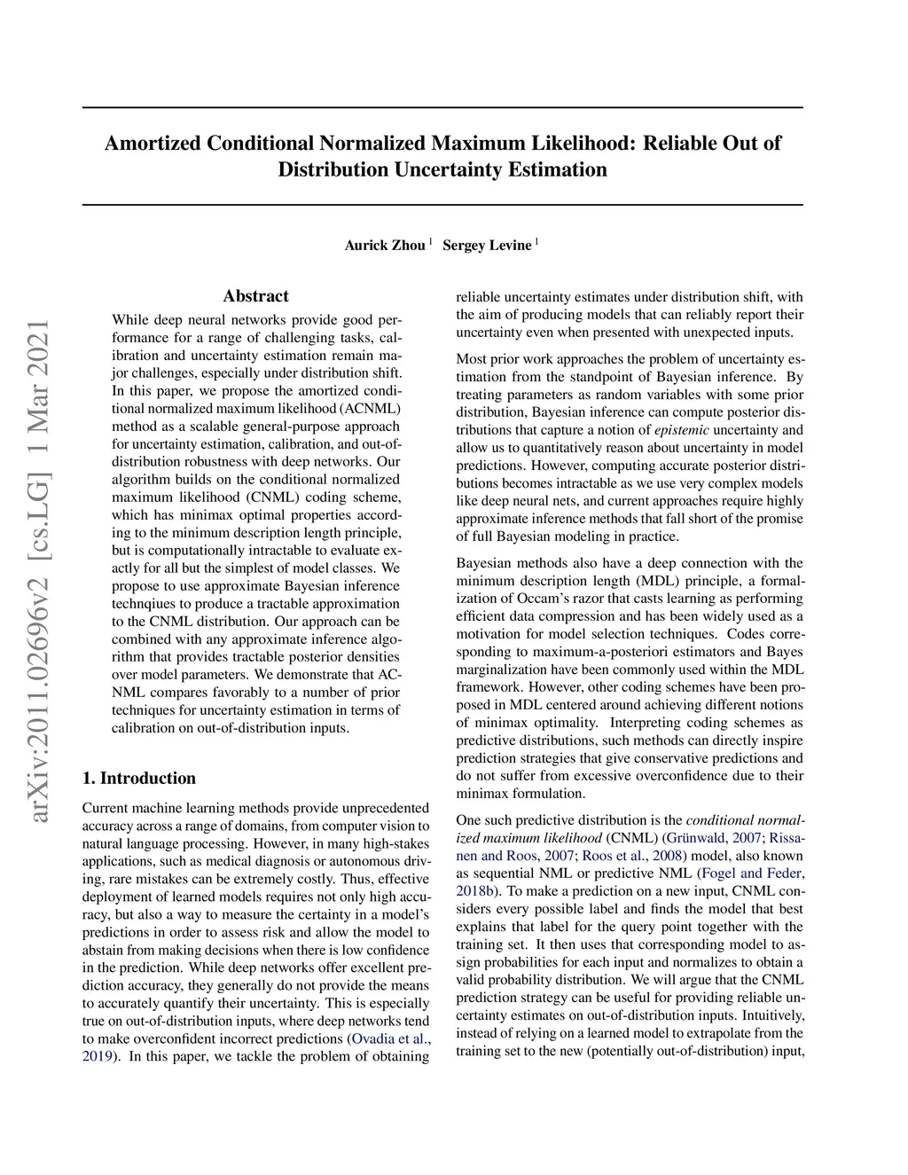 While deep neural networks provide good performance for a range of challenging tasks, calibration and uncertainty estimation remain major challenges. In this paper, we propose the amortized conditional normalized maximum likelihood (ACNML) method as a scalable general-purpose approach for uncertainty estimation, calibration, and out-of-distribution robustness with deep networks. Our algorithm builds on the conditional normalized maximum likelihood (CNML) coding scheme, which has minimax optimal properties according to the minimum description length principle, but is computationally intractable to evaluate exactly for all but the simplest of model classes. We propose to use approximate Bayesian inference technqiues to produce a tractable approximation to the CNML distribution. Our approach can be combined with any approximate inference algorithm that provides tractable posterior densities over model parameters. We demonstrate that ACNML compares favorably to a number of prior techniques for uncertainty estimation in terms of calibration on out-of-distribution inputs.