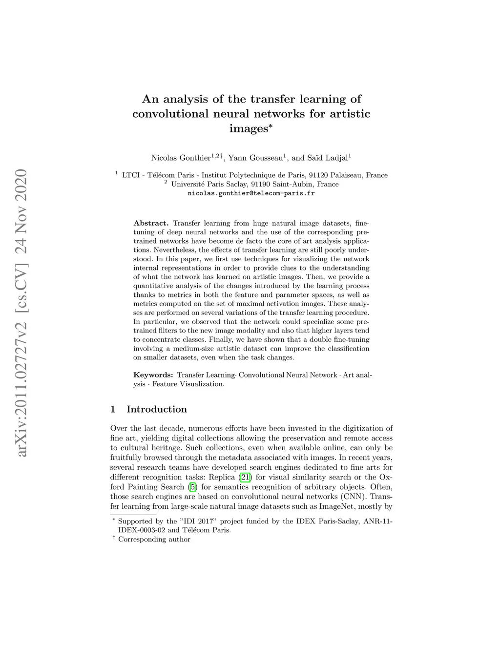 Transfer learning from huge natural image datasets, fine-tuning of deep neural networks and the use of the corresponding pre-trained networks have become de facto the core of art analysis applications. Nevertheless, the effects of transfer learning are still poorly understood. In this paper, we first use techniques for visualizing the network internal representations in order to provide clues to the understanding of what the network has learned on artistic images. Then, we provide a quantitative analysis of the changes introduced by the learning process thanks to metrics in both the feature and parameter spaces, as well as metrics computed on the set of maximal activation images. These analyses are performed on several variations of the transfer learning procedure. In particular, we observed that the network could specialize some pre-trained filters to the new image modality and also that higher layers tend to concentrate classes. Finally, we have shown that a double fine-tuning involving a medium-size artistic dataset can improve the classification on smaller datasets, even when the task changes.