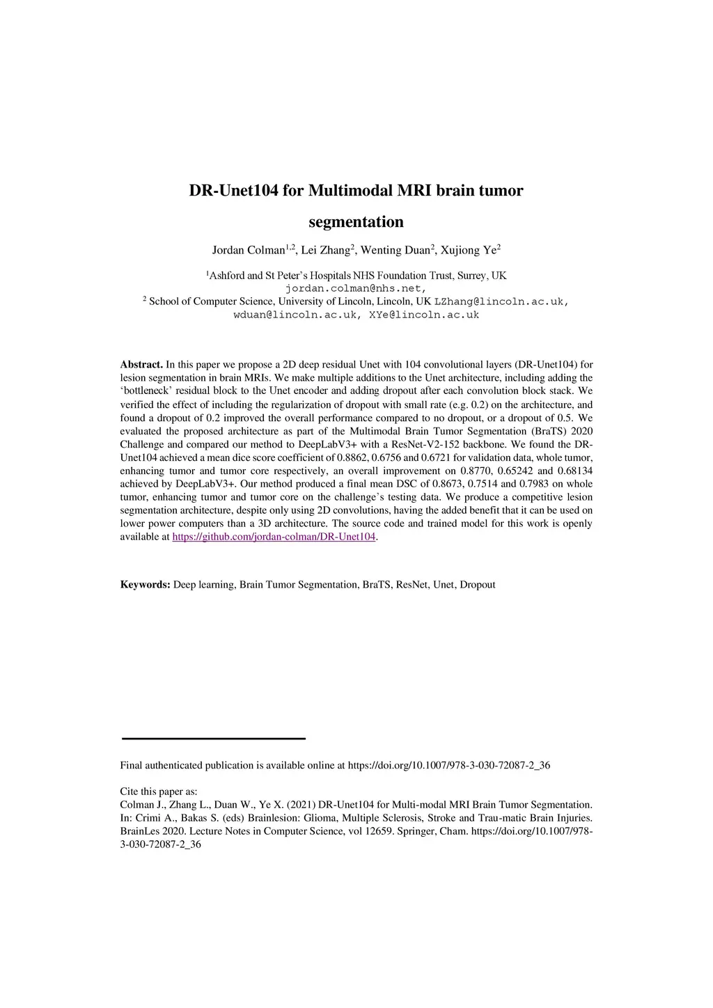 DR-Unet104 for Multimodal MRI brain tumor segmentation