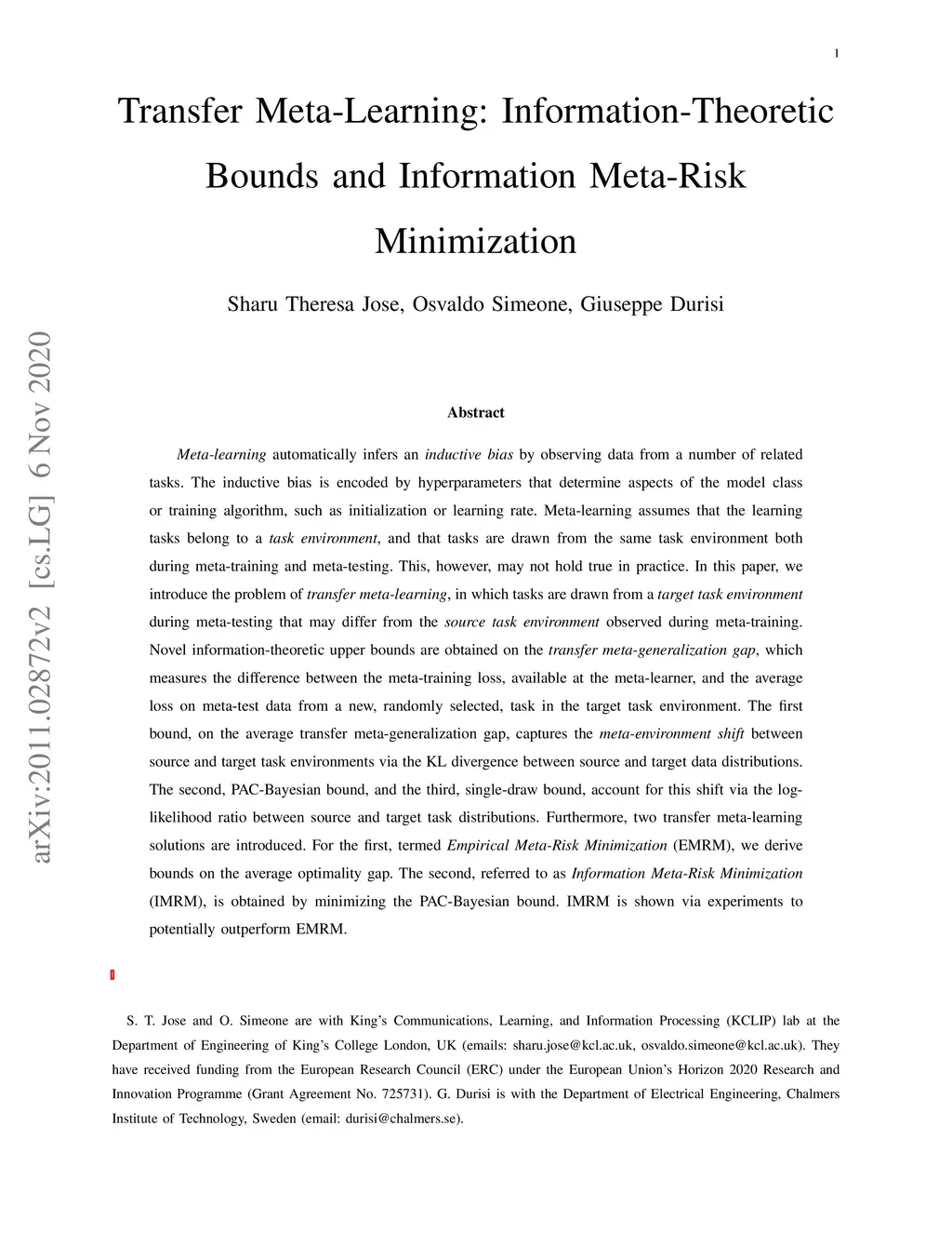 Meta-learning automatically infers an inductive bias by observing data from a number of related tasks. The inductive bias is encoded by hyperparameters that determine aspects of the model class or training algorithm, such as initialization or learning rate. Meta-learning assumes that the learning tasks belong to a task environment, and that tasks are drawn from the same task environment both during meta-training and meta-testing. This, however, may not hold true in practice. In this paper, we introduce the problem of transfer meta-learning, in which tasks are drawn from a target task environment during meta-testing that may differ from the source task environment observed during meta-training. Novel information-theoretic upper bounds are obtained on the transfer meta-generalization gap, which measures the difference between the meta-training loss, available at the meta-learner, and the average loss on meta-test data from a new, randomly selected, task in the target task environment. The first bound, on the average transfer meta-generalization gap, captures the meta-environment shift between source and target task environments via the KL divergence between source and target data distributions. The second, PAC-Bayesian bound, and the third, single-draw bound, account for this shift via the log-likelihood ratio between source and target task distributions. Furthermore, two transfer meta-learning solutions are introduced. For the first, termed Empirical Meta-Risk Minimization (EMRM), we derive bounds on the average optimality gap. The second, referred to as Information Meta-Risk Minimization (IMRM), is obtained by minimizing the PAC-Bayesian bound. IMRM is shown via experiments to potentially outperform EMRM.