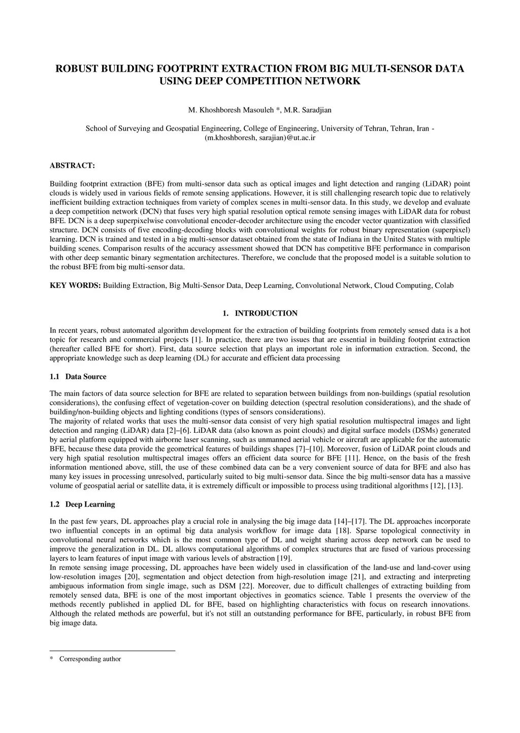 Building footprint extraction (BFE) from multi-sensor data such as optical images and light detection and ranging (LiDAR) point clouds is widely used in various fields of remote sensing applications. However, it is still challenging research topic due to relatively inefficient building extraction techniques from variety of complex scenes in multi-sensor data. In this study, we develop and evaluate a deep competition network (DCN) that fuses very high spatial resolution optical remote sensing images with LiDAR data for robust BFE. DCN is a deep superpixelwise convolutional encoder-decoder architecture using the encoder vector quantization with classified structure. DCN consists of five encoding-decoding blocks with convolutional weights for robust binary representation (superpixel) learning. DCN is trained and tested in a big multi-sensor dataset obtained from the state of Indiana in the United States with multiple building scenes. Comparison results of the accuracy assessment showed that DCN has competitive BFE performance in comparison with other deep semantic binary segmentation architectures. Therefore, we conclude that the proposed model is a suitable solution to the robust BFE from big multi-sensor data.