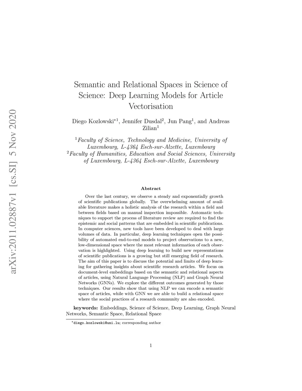 Over the last century, we observe a steady and exponentially growth of scientific publications globally. The overwhelming amount of available literature makes a holistic analysis of the research within a field and between fields based on manual inspection impossible. Automatic techniques to support the process of literature review are required to find the epistemic and social patterns that are embedded in scientific publications. In computer sciences, new tools have been developed to deal with large volumes of data. In particular, deep learning techniques open the possibility of automated end-to-end models to project observations to a new, low-dimensional space where the most relevant information of each observation is highlighted. Using deep learning to build new representations of scientific publications is a growing but still emerging field of research. The aim of this paper is to discuss the potential and limits of deep learning for gathering insights about scientific research articles. We focus on document-level embeddings based on the semantic and relational aspects of articles, using Natural Language Processing (NLP) and Graph Neural Networks (GNNs). We explore the different outcomes generated by those techniques. Our results show that using NLP we can encode a semantic space of articles, while with GNN we are able to build a relational space where the social practices of a research community are also encoded.