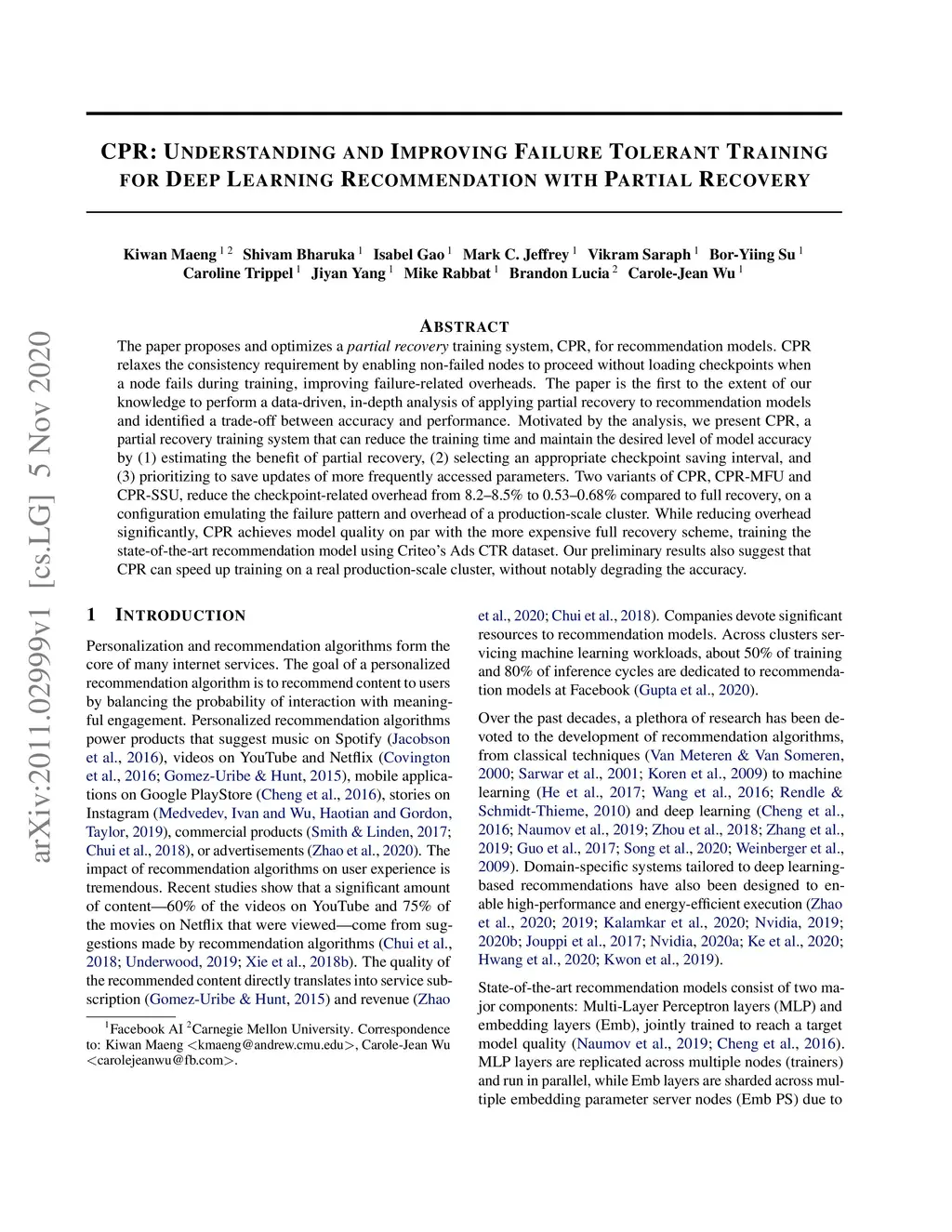 The paper proposes and optimizes a partial recovery training system, CPR, for recommendation models. CPR relaxes the consistency requirement by enabling non-failed nodes to proceed without loading checkpoints when a node fails during training, improving failure-related overheads. The paper is the first to the extent of our knowledge to perform a data-driven, in-depth analysis of applying partial recovery to recommendation models and identified a trade-off between accuracy and performance. Motivated by the analysis, we present CPR, a partial recovery training system that can reduce the training time and maintain the desired level of model accuracy by (1) estimating the benefit of partial recovery, (2) selecting an appropriate checkpoint saving interval, and (3) prioritizing to save updates of more frequently accessed parameters. Two variants of CPR, CPR-MFU and CPR-SSU, reduce the checkpoint-related overhead from 8.2-8.5% to 0.53-0.68% compared to full recovery, on a configuration emulating the failure pattern and overhead of a production-scale cluster. While reducing overhead significantly, CPR achieves model quality on par with the more expensive full recovery scheme, training the state-of-the-art recommendation model using Criteo's Ads CTR dataset. Our preliminary results also suggest that CPR can speed up training on a real production-scale cluster, without notably degrading the accuracy.