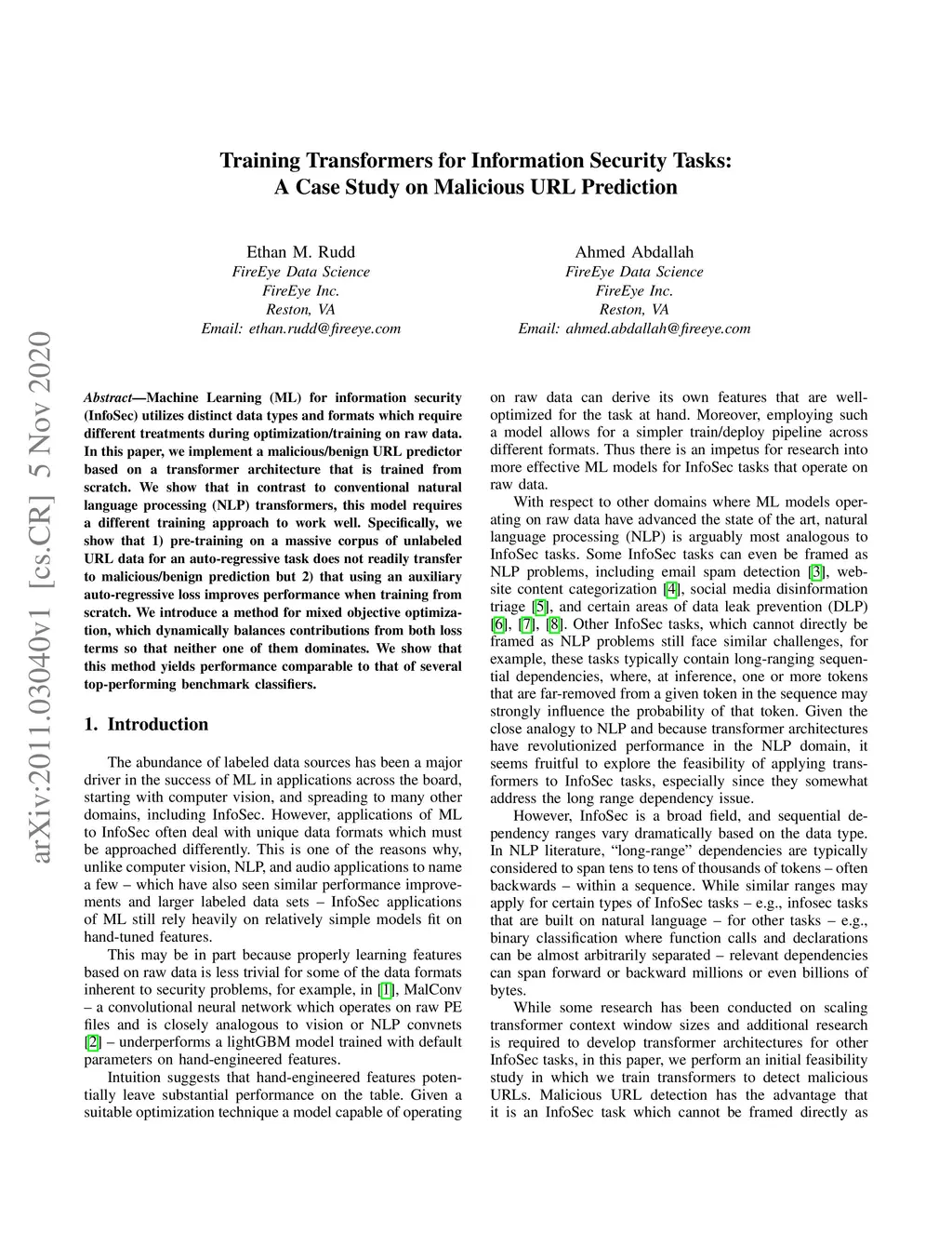 Machine Learning (ML) for information security (InfoSec) utilizes distinct data types and formats which require different treatments during optimization/training on raw data. In this paper, we implement a malicious/benign URL predictor based on a transformer architecture that is trained from scratch. We show that in contrast to conventional natural language processing (NLP) transformers, this model requires a different training approach to work well. Specifically, we show that 1) pre-training on a massive corpus of unlabeled URL data for an auto-regressive task does not readily transfer to malicious/benign prediction but 2) that using an auxiliary auto-regressive loss improves performance when training from scratch. We introduce a method for mixed objective optimization, which dynamically balances contributions from both loss terms so that neither one of them dominates. We show that this method yields performance comparable to that of several top-performing benchmark classifiers.