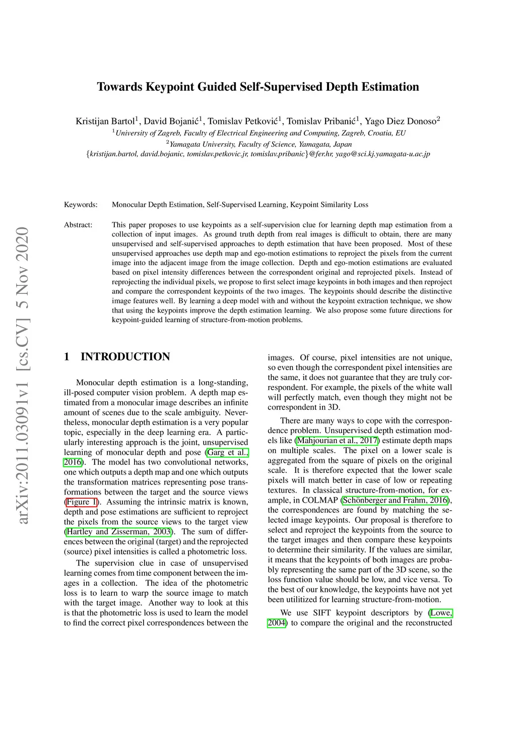 This paper proposes to use keypoints as a self-supervision clue for learning depth map estimation from a collection of input images. As ground truth depth from real images is difficult to obtain, there are many unsupervised and self-supervised approaches to depth estimation that have been proposed. Most of these unsupervised approaches use depth map and ego-motion estimations to reproject the pixels from the current image into the adjacent image from the image collection. Depth and ego-motion estimations are evaluated based on pixel intensity differences between the correspondent original and reprojected pixels. Instead of reprojecting the individual pixels, we propose to first select image keypoints in both images and then reproject and compare the correspondent keypoints of the two images. The keypoints should describe the distinctive image features well. By learning a deep model with and without the keypoint extraction technique, we show that using the keypoints improve the depth estimation learning. We also propose some future directions for keypoint-guided learning of structure-from-motion problems.