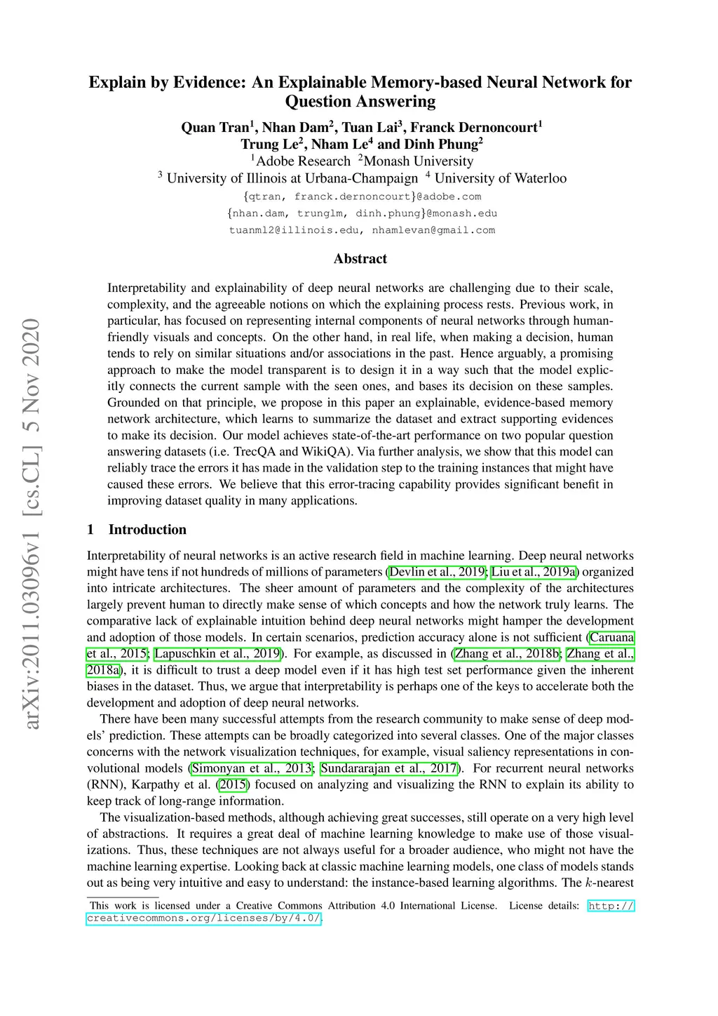 Interpretability and explainability of deep neural networks are challenging due to their scale, complexity, and the agreeable notions on which the explaining process rests. Previous work, in particular, has focused on representing internal components of neural networks through human-friendly visuals and concepts. On the other hand, in real life, when making a decision, human tends to rely on similar situations and/or associations in the past. Hence arguably, a promising approach to make the model transparent is to design it in a way such that the model explicitly connects the current sample with the seen ones, and bases its decision on these samples. Grounded on that principle, we propose in this paper an explainable, evidence-based memory network architecture, which learns to summarize the dataset and extract supporting evidences to make its decision. Our model achieves state-of-the-art performance on two popular question answering datasets (i.e. TrecQA and WikiQA). Via further analysis, we show that this model can reliably trace the errors it has made in the validation step to the training instances that might have caused these errors. We believe that this error-tracing capability provides significant benefit in improving dataset quality in many applications.