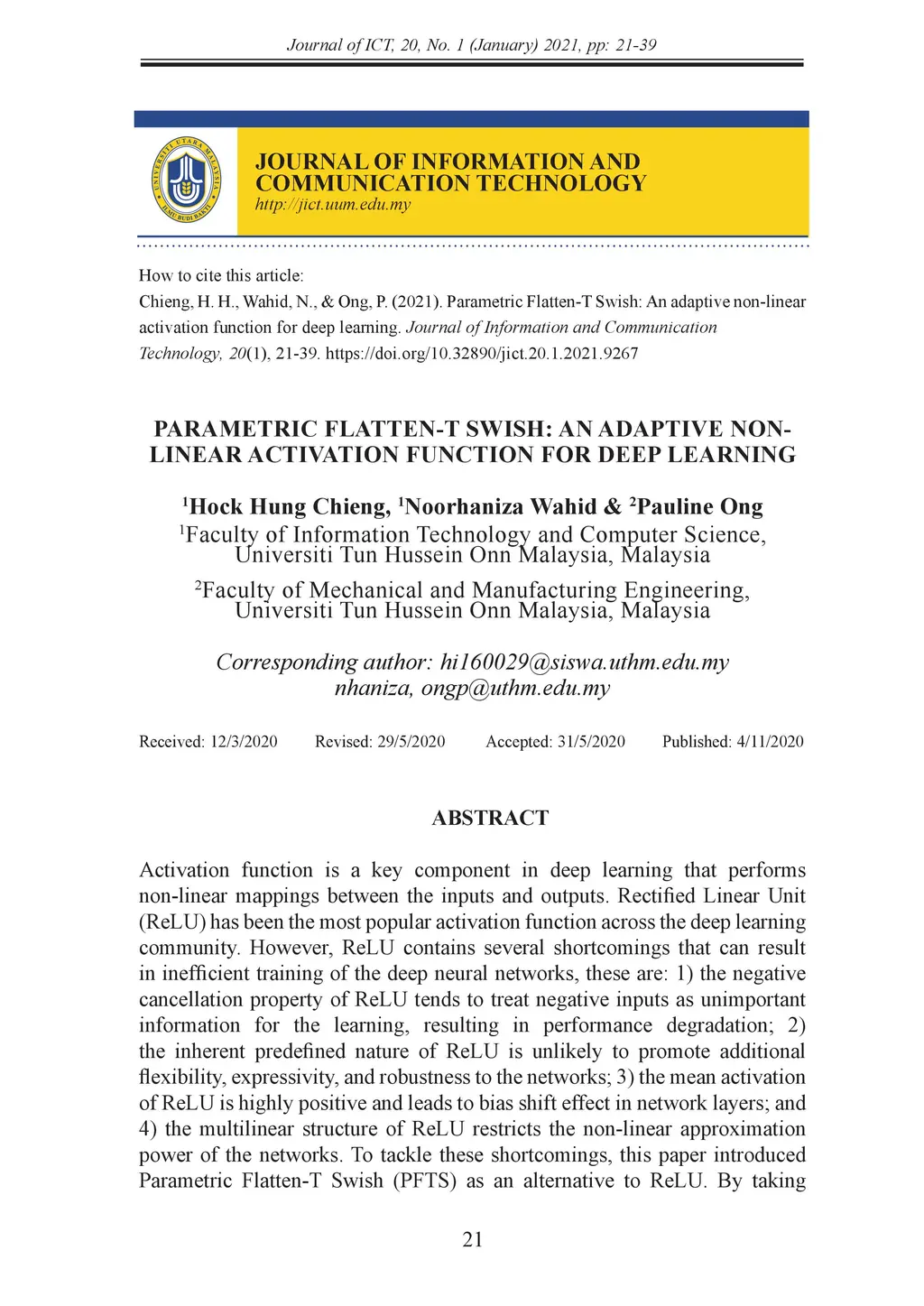 Parametric Flatten-T Swish: An Adaptive Non-linear Activation Function