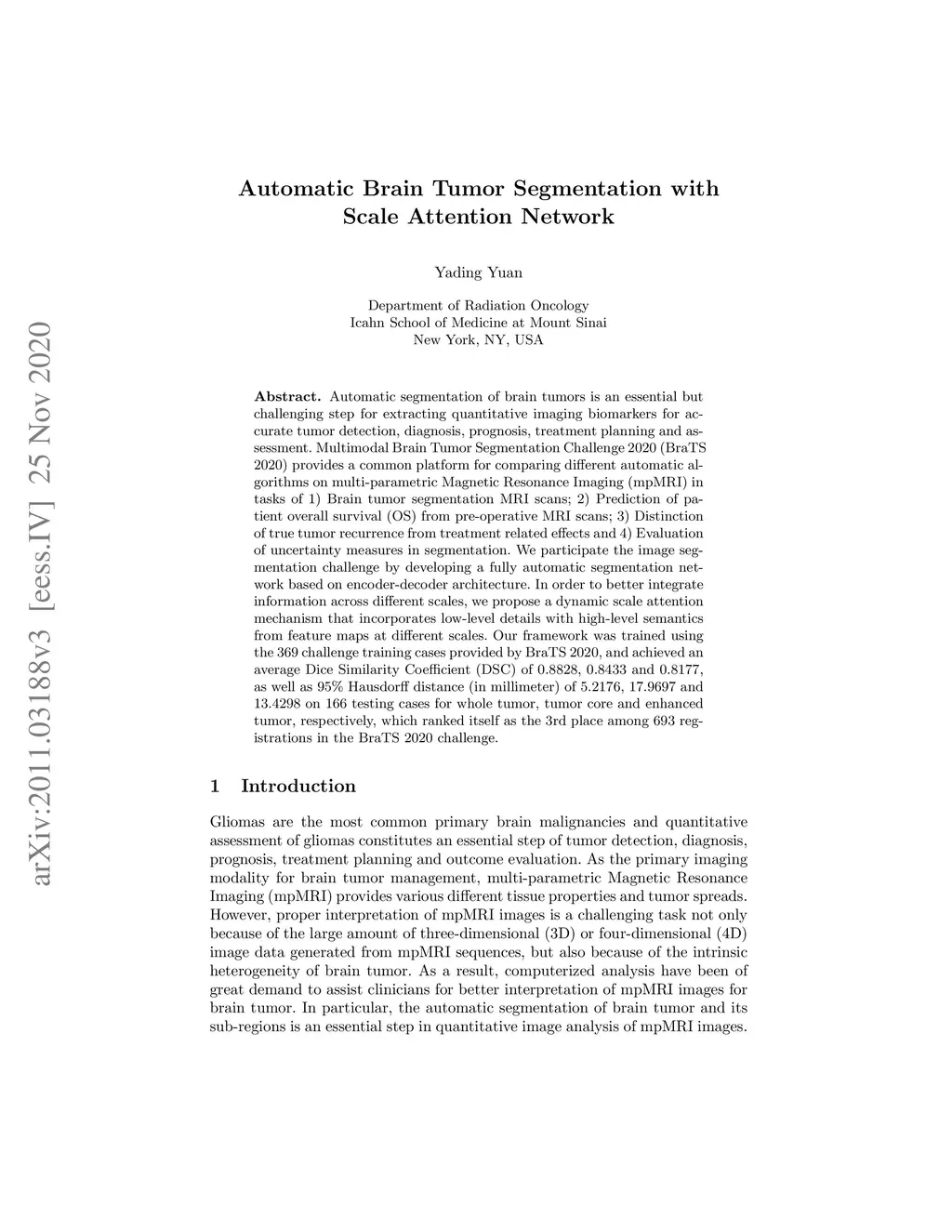 Automatic segmentation of brain tumors is an essential but challenging step for extracting quantitative imaging biomarkers for accurate tumor detection, diagnosis, prognosis, treatment planning and assessment. Multimodal Brain Tumor Segmentation Challenge 2020 (BraTS 2020) provides a common platform for comparing different automatic algorithms on multi-parametric Magnetic Resonance Imaging (mpMRI) in tasks of 1) Brain tumor segmentation MRI scans; 2) Prediction of patient overall survival (OS) from pre-operative MRI scans; 3) Distinction of true tumor recurrence from treatment related effects and 4) Evaluation of uncertainty measures in segmentation. We participate the image segmentation challenge by developing a fully automatic segmentation network based on encoder-decoder architecture. In order to better integrate information across different scales, we propose a dynamic scale attention mechanism that incorporates low-level details with high-level semantics from feature maps at different scales. Our framework was trained using the 369 challenge training cases provided by BraTS 2020, and achieved an average Dice Similarity Coefficient (DSC) of 0.8828, 0.8433 and 0.8177, as well as 95% Hausdorff distance (in millimeter) of 5.2176, 17.9697 and 13.4298 on 166 testing cases for whole tumor, tumor core and enhanced tumor, respectively, which ranked itself as the 3rd place among 693 registrations in the BraTS 2020 challenge.