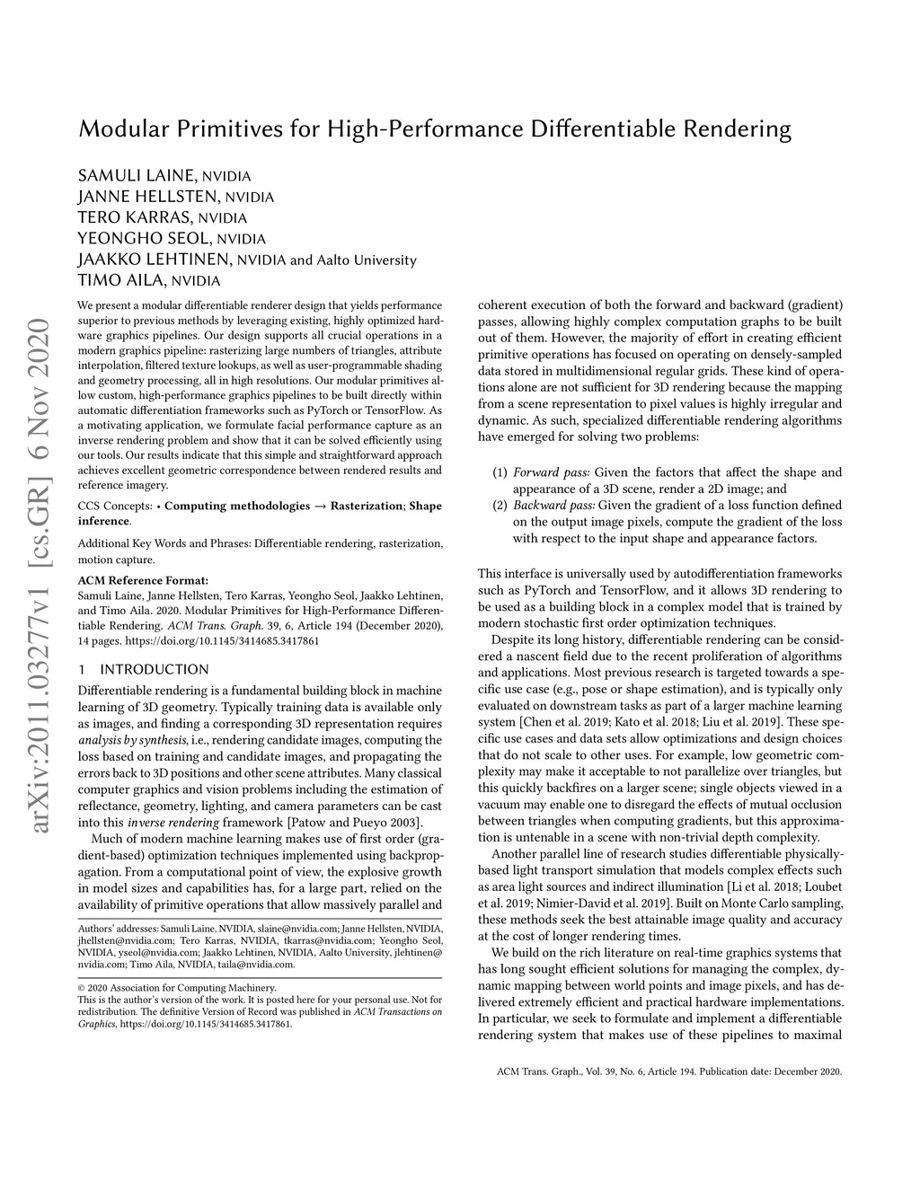 We present a modular differentiable renderer design that yields performance superior to previous methods by leveraging existing, highly optimized hardware graphics pipelines. Our design supports all crucial operations in a modern graphics pipeline: rasterizing large numbers of triangles, attribute interpolation, filtered texture lookups, as well as user-programmable shading and geometry processing, all in high resolutions. Our modular primitives allow custom, high-performance graphics pipelines to be built directly within automatic differentiation frameworks such as PyTorch or TensorFlow. As a motivating application, we formulate facial performance capture as an inverse rendering problem and show that it can be solved efficiently using our tools. Our results indicate that this simple and straightforward approach achieves excellent geometric correspondence between rendered results and reference imagery.