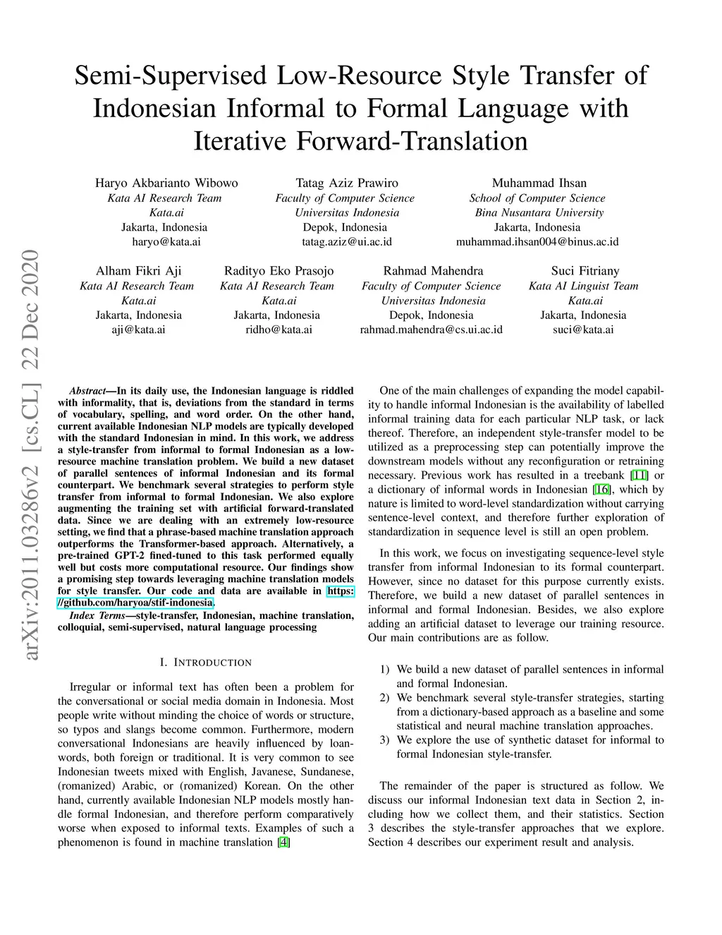 Semi-Supervised Low-Resource Style Transfer of Indonesian Informal to