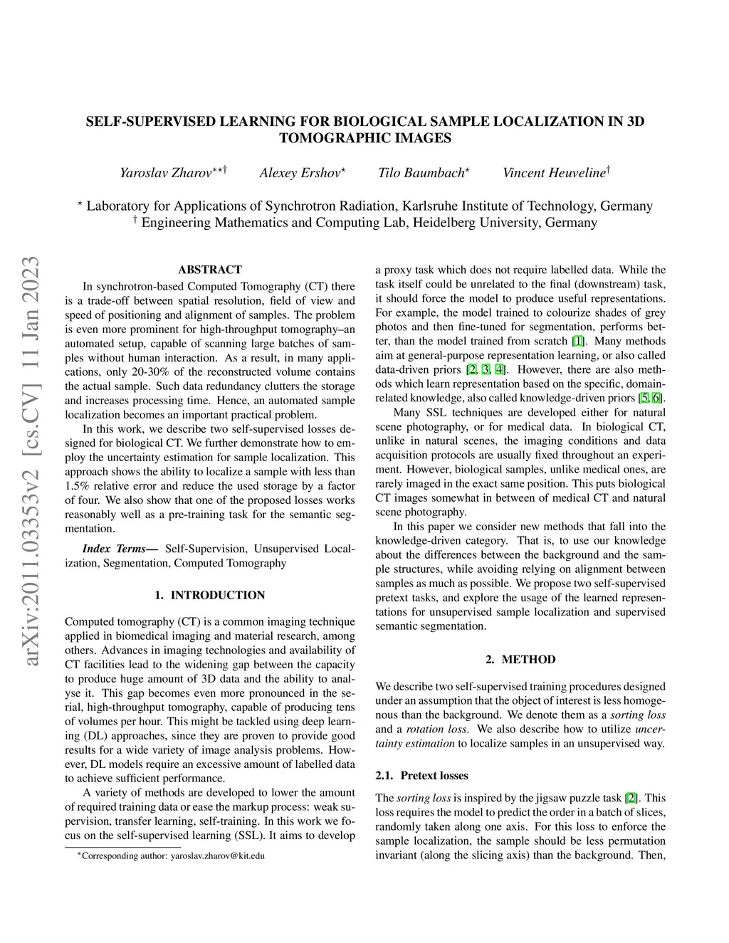 In synchrotron-based Computed Tomography (CT) there is a trade-off between spatial resolution, field of view and speed of positioning and alignment of samples. The problem is even more prominent for high-throughput tomography--an automated setup, capable of scanning large batches of samples without human interaction. As a result, in many applications, only 20-30% of the reconstructed volume contains the actual sample. Such data redundancy clutters the storage and increases processing time. Hence, an automated sample localization becomes an important practical problem. In this work, we describe two self-supervised losses designed for biological CT. We further demonstrate how to employ the uncertainty estimation for sample localization. This approach shows the ability to localize a sample with less than 1.5\% relative error and reduce the used storage by a factor of four. We also show that one of the proposed losses works reasonably well as a pre-training task for the semantic segmentation.