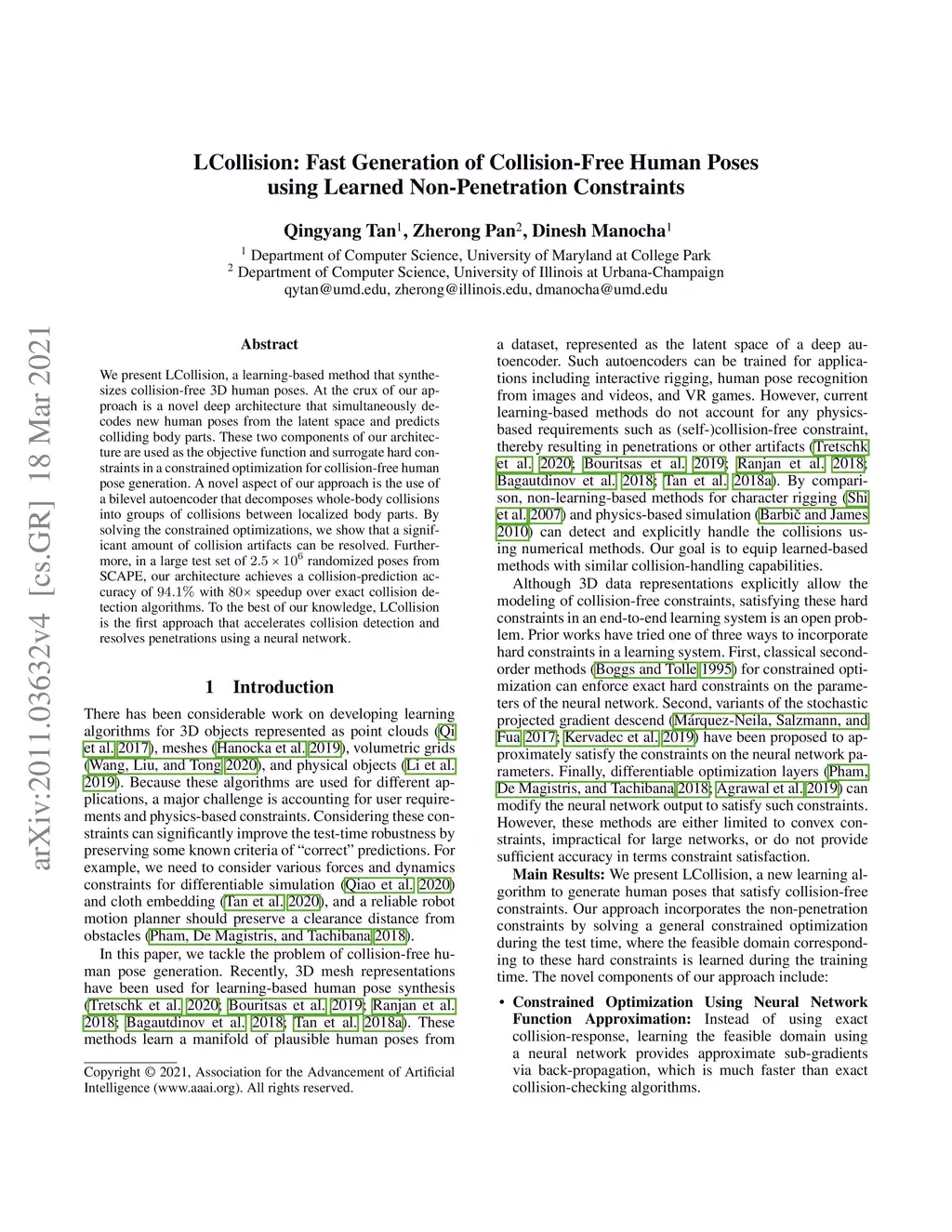 We present LCollision, a learning-based method that synthesizes collision-free 3D human poses. At the crux of our approach is a novel deep architecture that simultaneously decodes new human poses from the latent space and predicts colliding body parts. These two components of our architecture are used as the objective function and surrogate hard constraints in a constrained optimization for collision-free human pose generation. A novel aspect of our approach is the use of a bilevel autoencoder that decomposes whole-body collisions into groups of collisions between localized body parts. By solving the constrained optimizations, we show that a significant amount of collision artifacts can be resolved. Furthermore, in a large test set of randomized poses from SCAPE, our architecture achieves a collision-prediction accuracy of with speedup over exact collision detection algorithms. To the best of our knowledge, LCollision is the first approach that accelerates collision detection and resolves penetrations using a neural network.