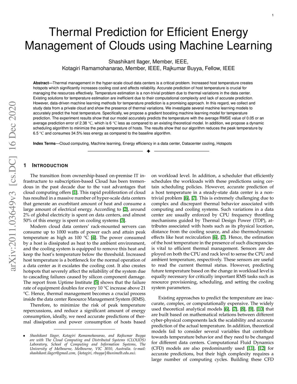 Thermal Prediction for Efficient Energy Management of Clouds using