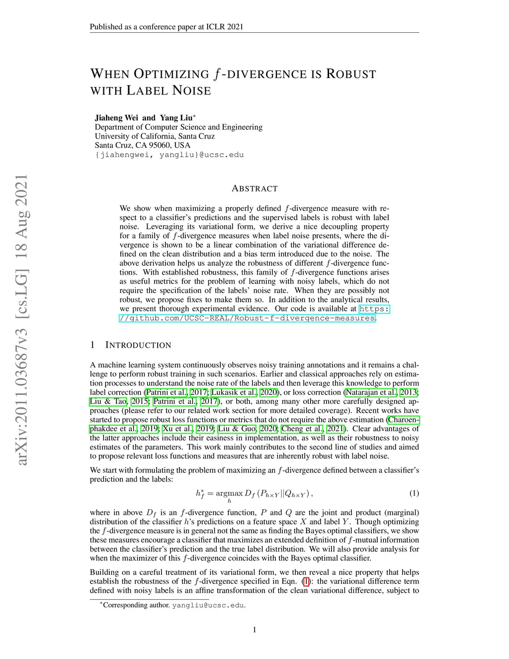 We show when maximizing a properly defined -divergence measure with respect to a classifier's predictions and the supervised labels is robust with label noise. Leveraging its variational form, we derive a nice decoupling property for a family of -divergence measures when label noise presents, where the divergence is shown to be a linear combination of the variational difference defined on the clean distribution and a bias term introduced due to the noise. The above derivation helps us analyze the robustness of different -divergence functions. With established robustness, this family of -divergence functions arises as useful metrics for the problem of learning with noisy labels, which do not require the specification of the labels' noise rate. When they are possibly not robust, we propose fixes to make them so. In addition to the analytical results, we present thorough experimental evidence. Our code is available at https://github.com/UCSC-REAL/Robust-f-divergence-measures.