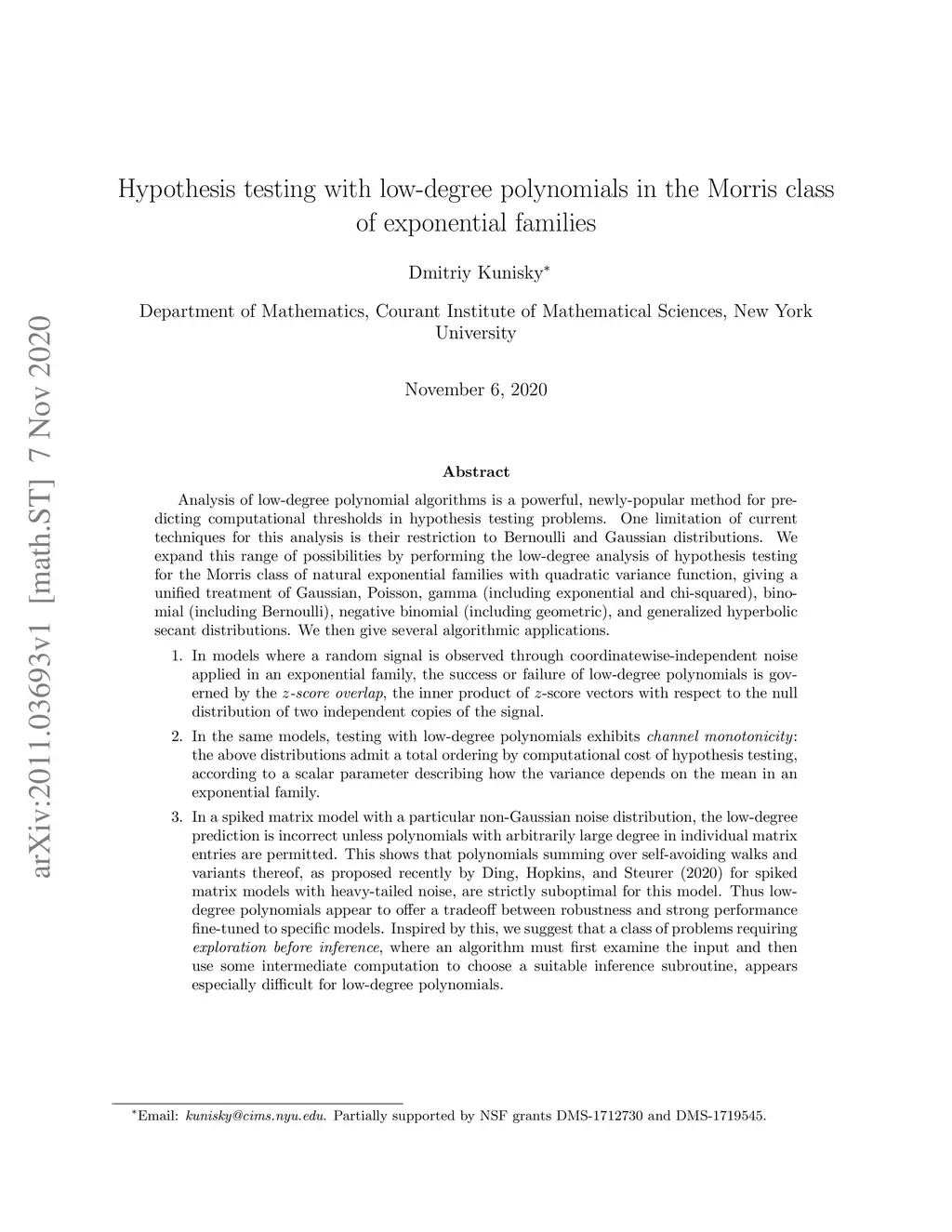 Analysis of low-degree polynomial algorithms is a powerful, newly-popular method for predicting computational thresholds in hypothesis testing problems. One limitation of current techniques for this analysis is their restriction to Bernoulli and Gaussian distributions. We expand this range of possibilities by performing the low-degree analysis of hypothesis testing for the Morris class of exponential families, giving a unified treatment of Gaussian, Poisson, gamma, binomial, negative binomial, and generalized hyperbolic secant distributions. We then give several algorithmic applications. 1. In models where a random signal is observed through an exponential family, the success or failure of low-degree polynomials is governed by the -score overlap, the inner product of -score vectors with respect to the null distribution of two independent copies of the signal. 2. In the same models, testing with low-degree polynomials exhibits channel monotonicity: the above distributions admit a total ordering by computational cost of hypothesis testing, according to a scalar parameter describing how the variance depends on the mean in an exponential family. 3. In a spiked matrix model with a particular non-Gaussian noise distribution, the low-degree prediction is incorrect unless polynomials with arbitrarily large degree in individual matrix entries are permitted. This shows that polynomials summing over self-avoiding walks and variants thereof, as proposed recently by Ding, Hopkins, and Steurer (2020) for spiked matrix models with heavy-tailed noise, are suboptimal for this model. Thus low-degree polynomials appear to offer a tradeoff between robustness and strong performance fine-tuned to specific models, and may struggle with problems requiring an algorithm to first examine the input and then use some intermediate computation to choose from one of several inference subroutines.