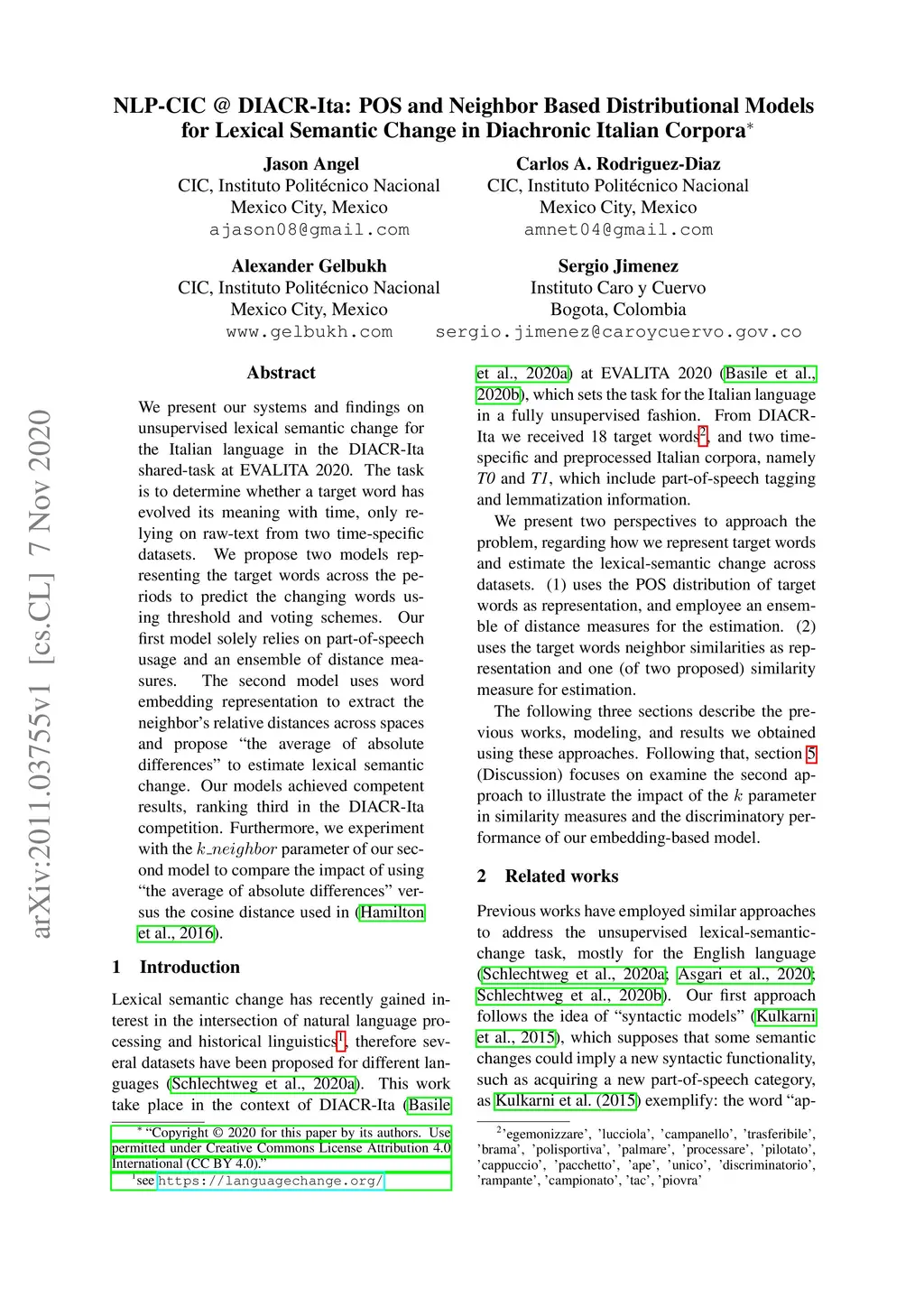 We present our systems and findings on unsupervised lexical semantic change for the Italian language in the DIACR-Ita shared-task at EVALITA 2020. The task is to determine whether a target word has evolved its meaning with time, only relying on raw-text from two time-specific datasets. We propose two models representing the target words across the periods to predict the changing words using threshold and voting schemes. Our first model solely relies on part-of-speech usage and an ensemble of distance measures. The second model uses word embedding representation to extract the neighbor's relative distances across spaces and propose "the average of absolute differences" to estimate lexical semantic change. Our models achieved competent results, ranking third in the DIACR-Ita competition. Furthermore, we experiment with the k_neighbor parameter of our second model to compare the impact of using "the average of absolute differences" versus the cosine distance used in Hamilton et al. (2016).