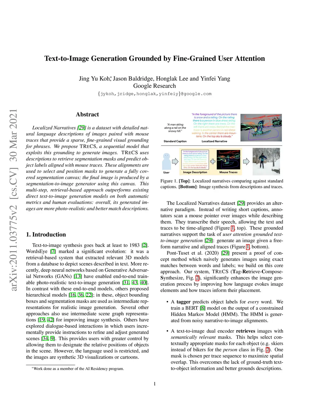 Localized Narratives is a dataset with detailed natural language descriptions of images paired with mouse traces that provide a sparse, fine-grained visual grounding for phrases. We propose TReCS, a sequential model that exploits this grounding to generate images. TReCS uses descriptions to retrieve segmentation masks and predict object labels aligned with mouse traces. These alignments are used to select and position masks to generate a fully covered segmentation canvas; the final image is produced by a segmentation-to-image generator using this canvas. This multi-step, retrieval-based approach outperforms existing direct text-to-image generation models on both automatic metrics and human evaluations: overall, its generated images are more photo-realistic and better match descriptions.